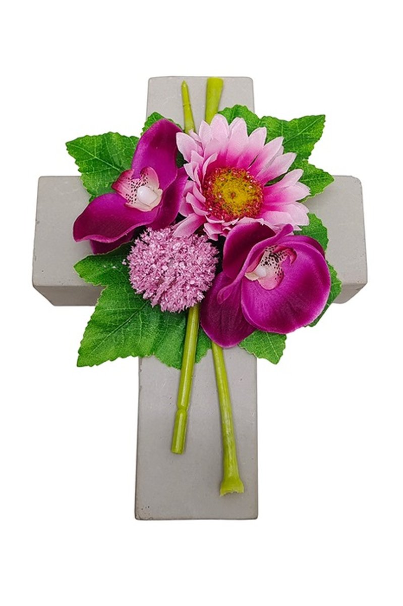Kunstblumengesteck Gerbera, Orchidee, Allium ANSGAR, Pflanzkreuz, pink-rosa, 20x15x9cm