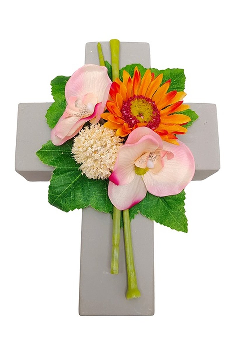Kunstblumengesteck Gerbera, Orchidee, Allium ANSGAR, Pflanzkreuz, rosa-orange, 20x15x9cm