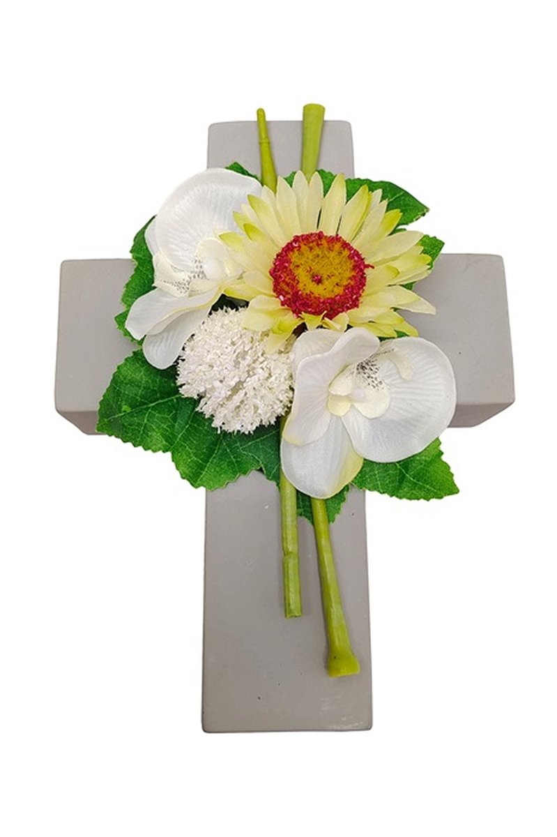 Kunstblumengesteck Gerbera, Orchidee, Allium ANSGAR, Pflanzkreuz, weiß-gelb, 20x15x9cm