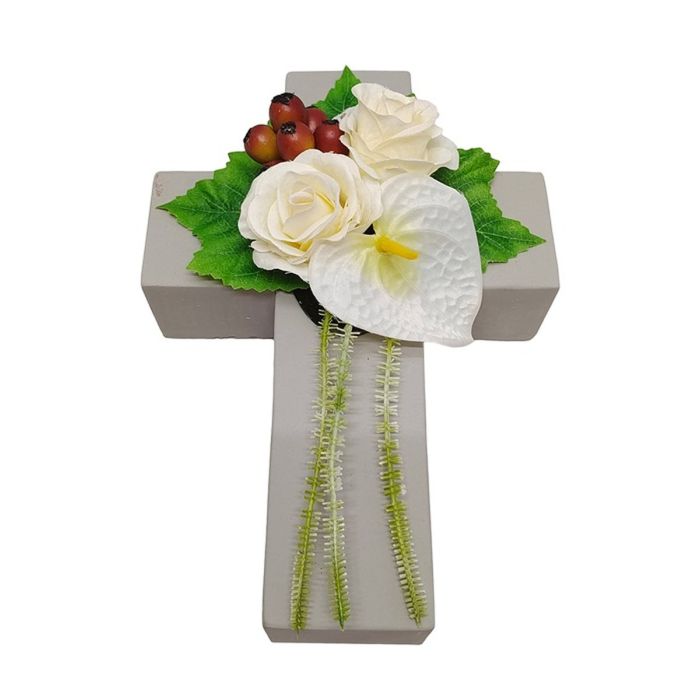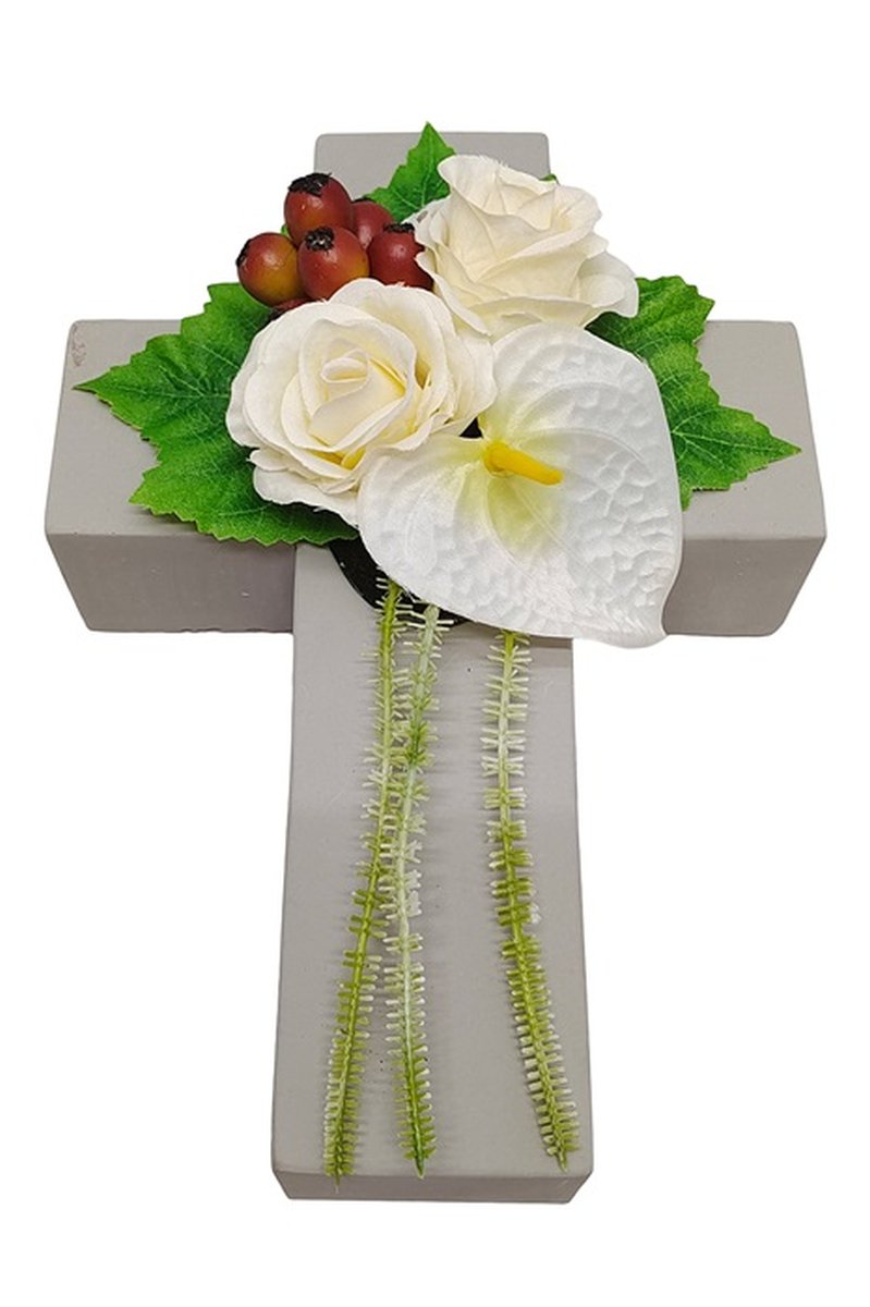 - Das geschmackvolle Blumengesteck auf einem Kreuz ist eine schöne Bereicherung z.B. für den Grabschmuck, bitte beachten Sie das wir für die Verwendung im Außenbereich keine Garantie auf die Langlebigkeit und Beständigkeit geben können, die Kunstblumen können sich durch die UV-Strahlung verfärben, brüchig werden oder durch Wind abreißen!