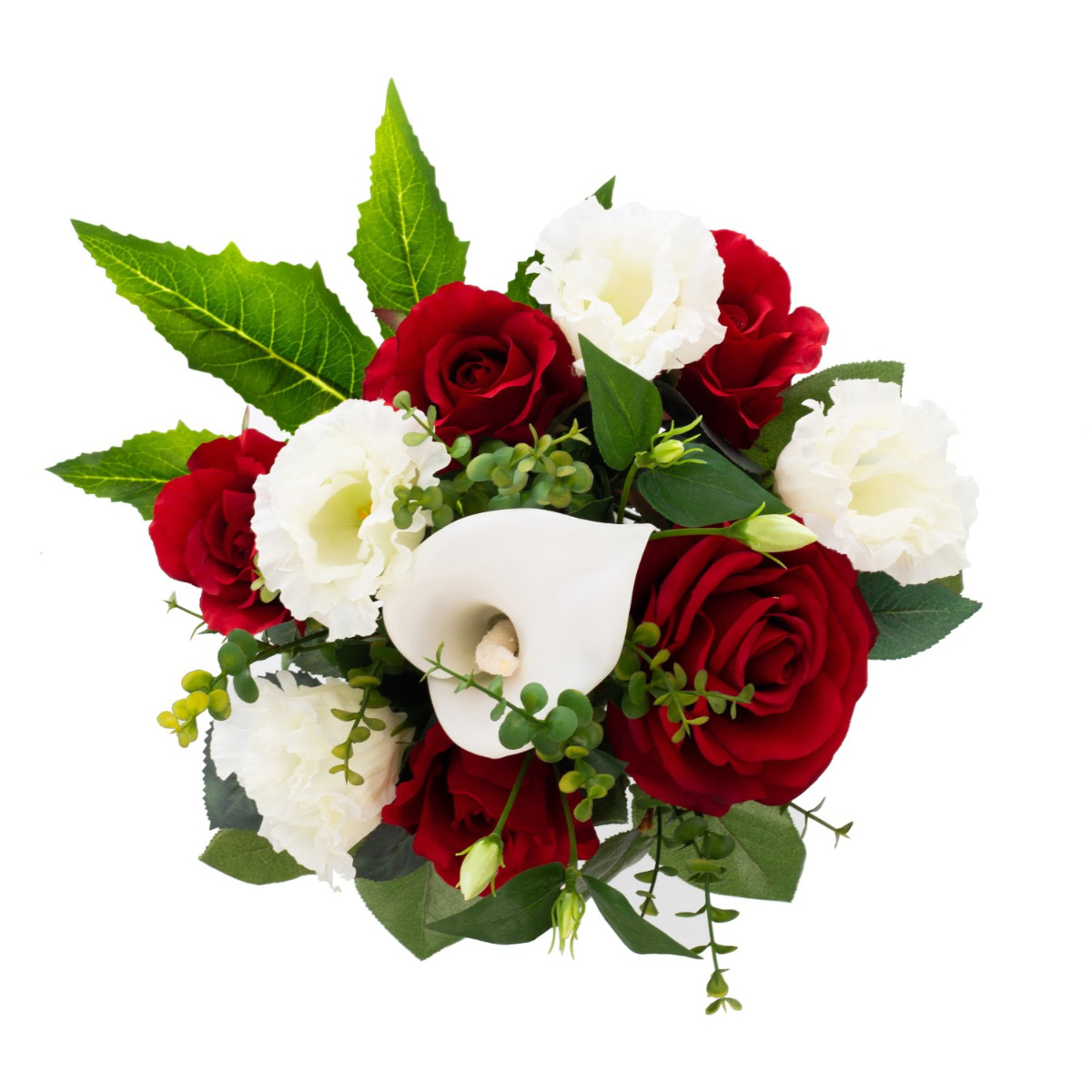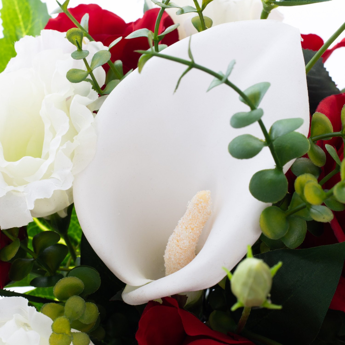 Der elegante Kunstblumenstrauß ELAYNA hinterlässt einen bleibenden Eindruck beim Beschenkten und ist daher für ganz besondere Anlässe bestens geeignet. Rote Rosen setzen gekonnt Akzente und werden vom weißen Lisianthus umspielt ein besonderes Augenmerk gilt der Calla die in der Mitte des Bouquets thront. Abgerundet wird das Blumenensemble von Eukalyptus der den Strauß auflockert, sowie von einer Blattmanschette bestehend aus Apfelzweigen und einem großen Araliablatt.