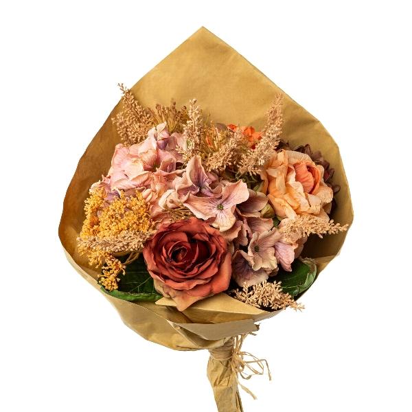 Kunstblumenstrauß Rose Hortensie Skimmie FORTA, orange-lachs-altrosa, 50cm