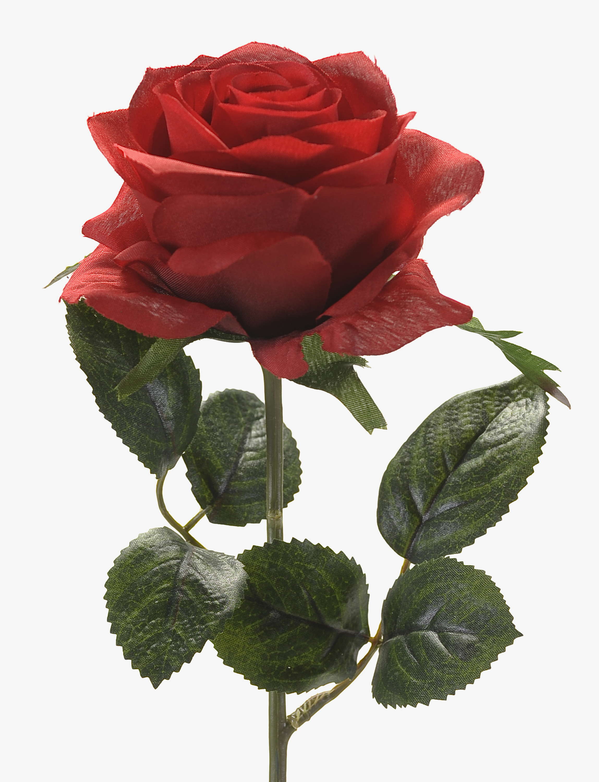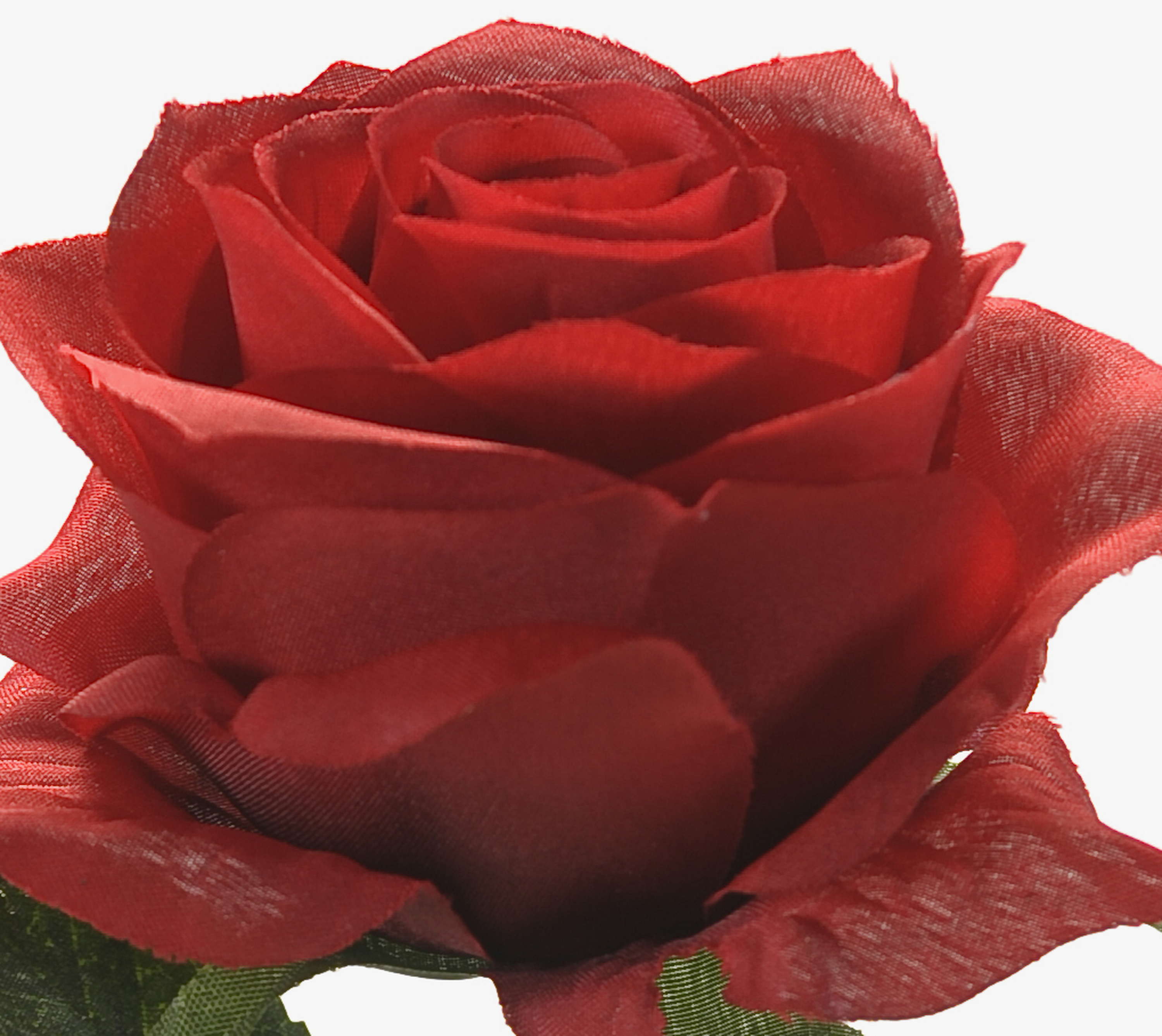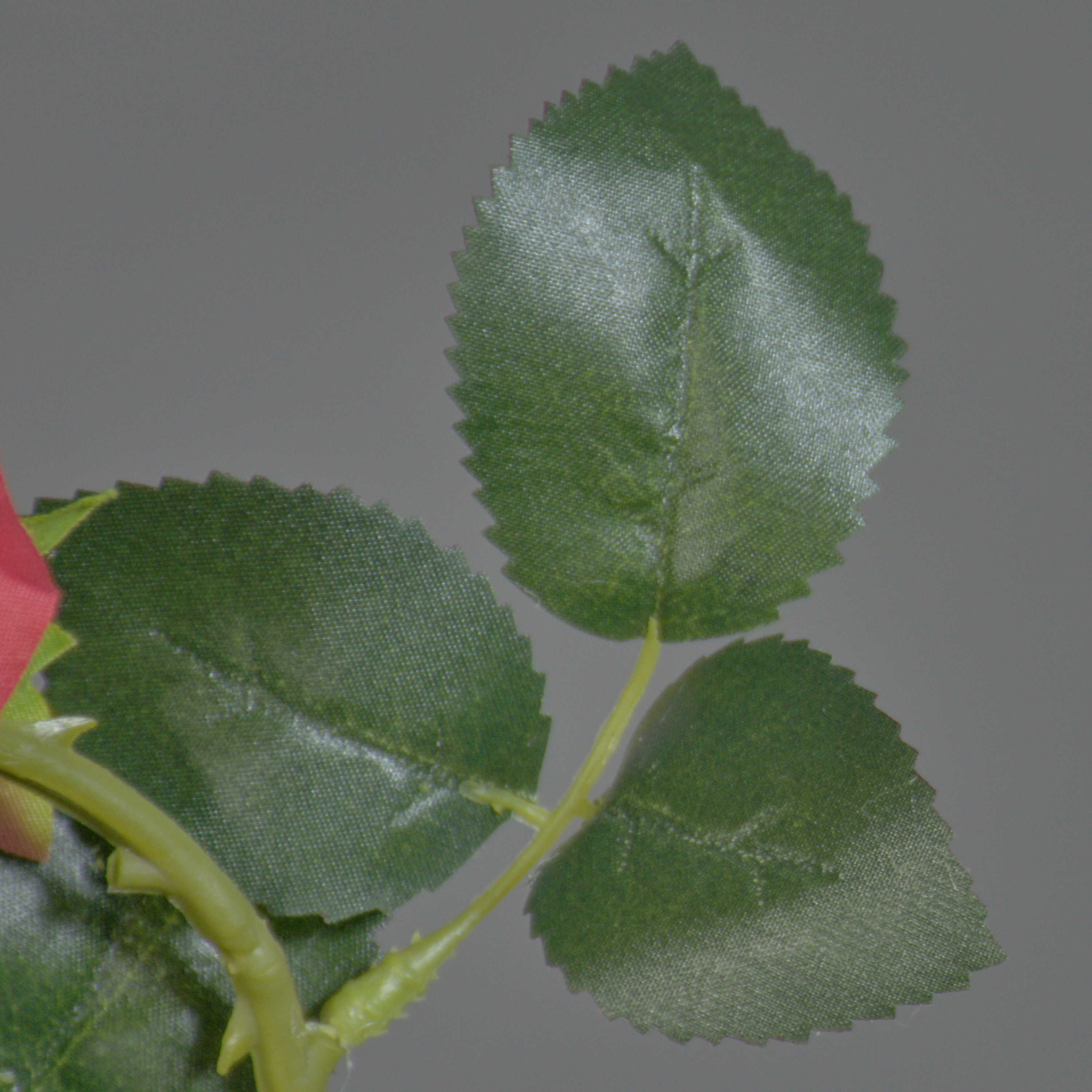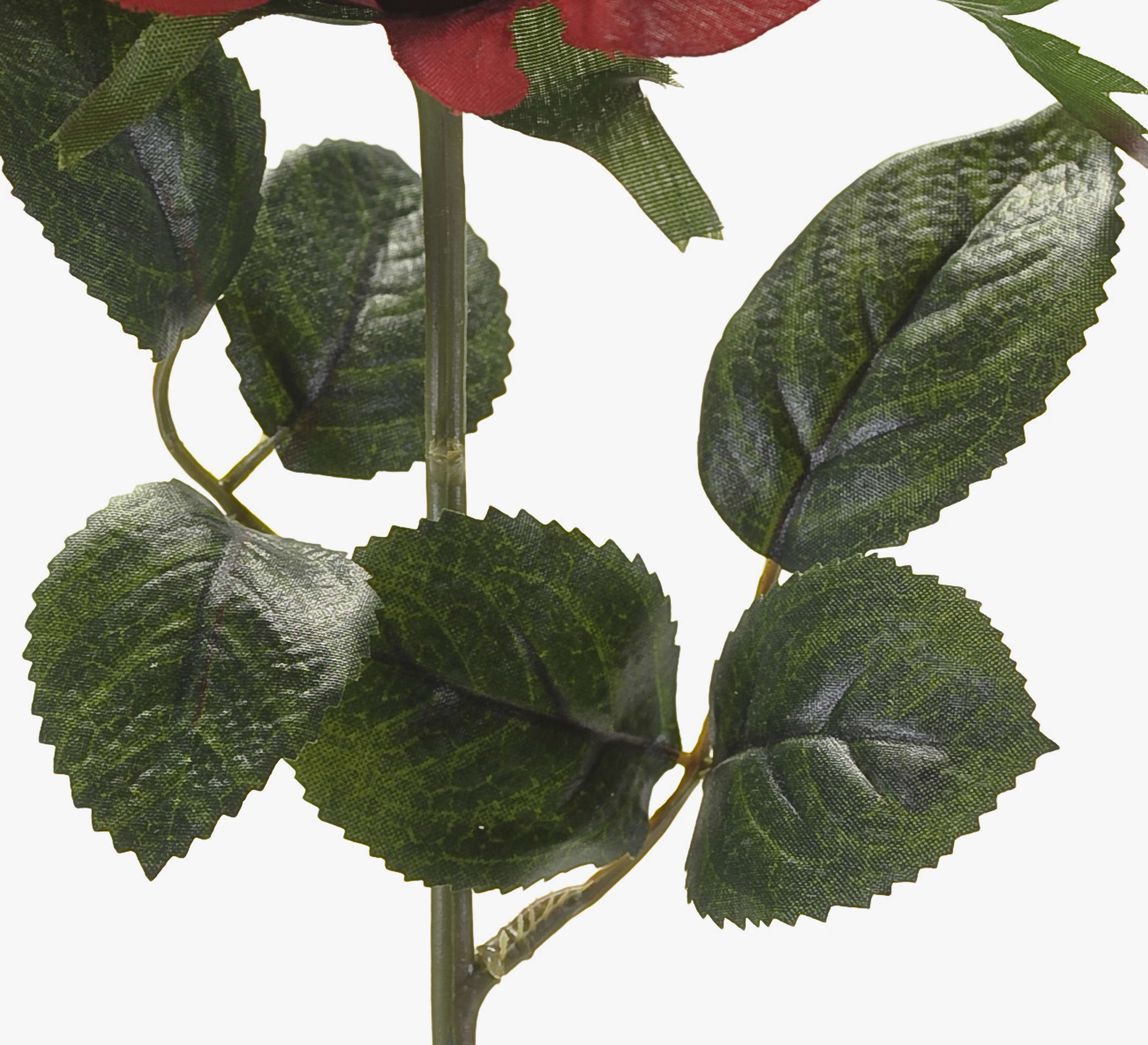 - Hochwertig verarbeitete offene rote Blüte und viele grüne Blätter, alles aus Textilfaser