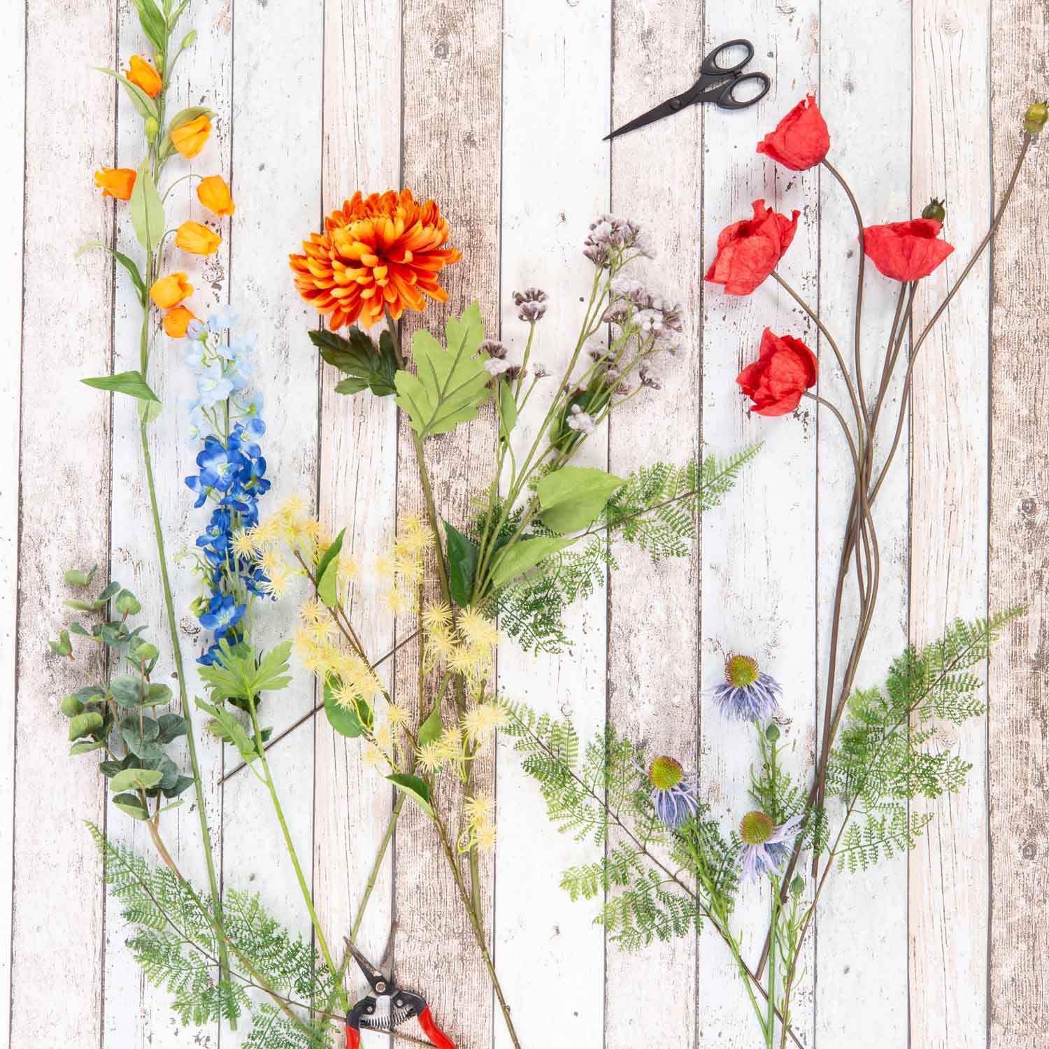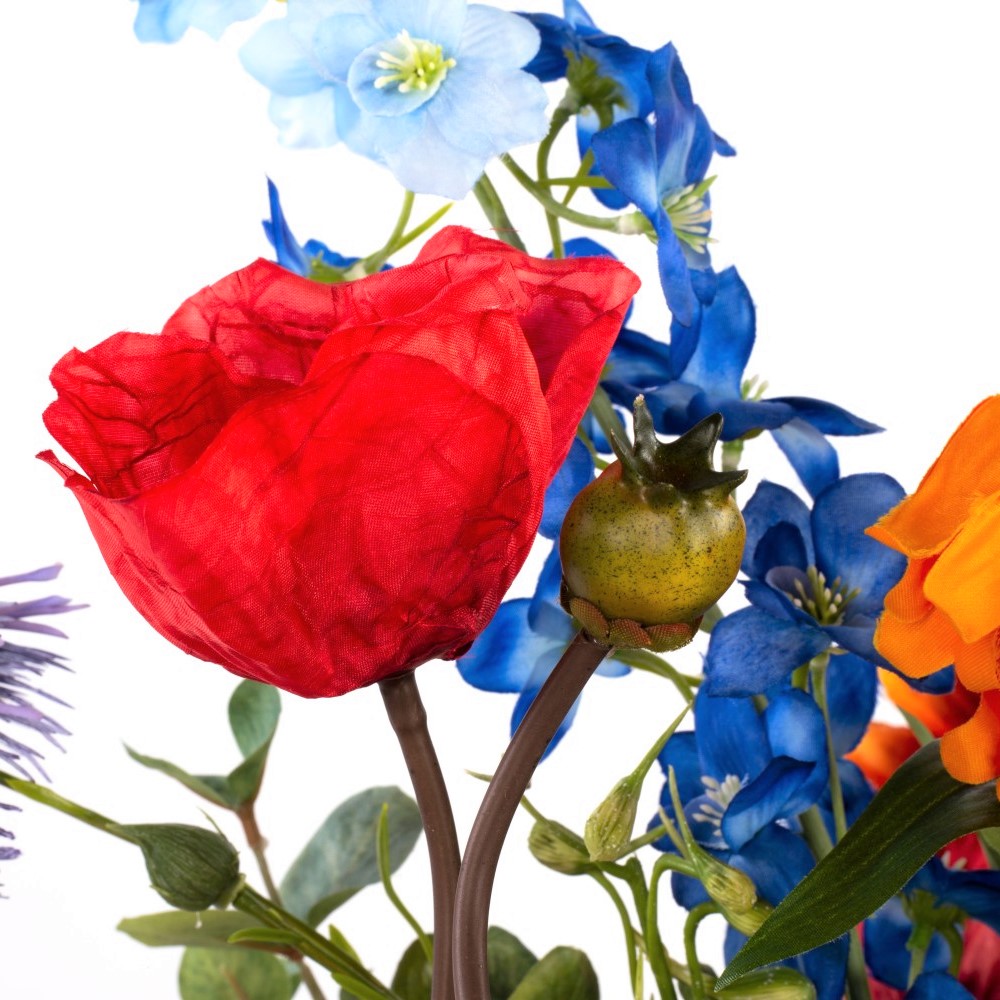 Einen bezaubernden Sommergruß stellt dieser künstliche Blumenstrauß LOLANA dar. Neben üppiger Chrysantheme, verspieltem Sonnenhut und freundlicher Mohnblumen ragen Rittersporn und Laternenlilie aus dem Blumenensemble heraus. Umrahmt wird der künstliche Strauß von Eukalyptus und filigranem Schildfarn.