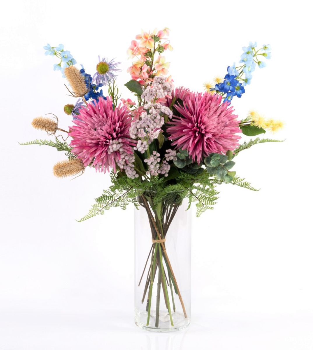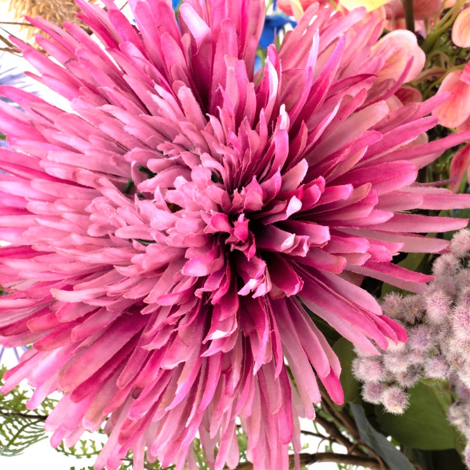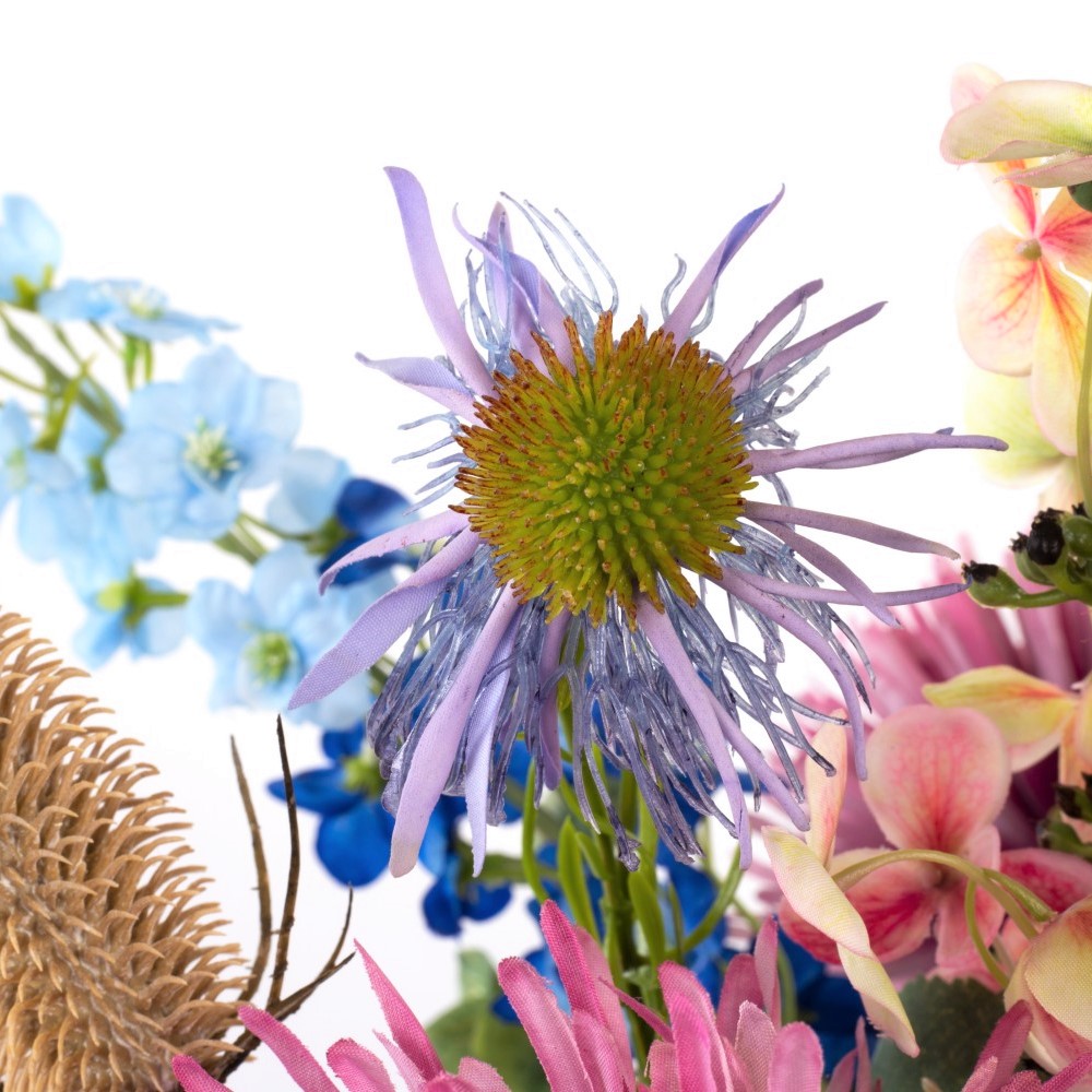 Einen bezaubernden Sommergruß stellt dieser künstliche Blumenstrauß LOLANA dar. Neben üppiger Chrysantheme, verspieltem Sonnenhut und freundlicher Wilden Karde ragen Rittersporn und Rispen-Hortensie aus dem Blumenensemble heraus.
