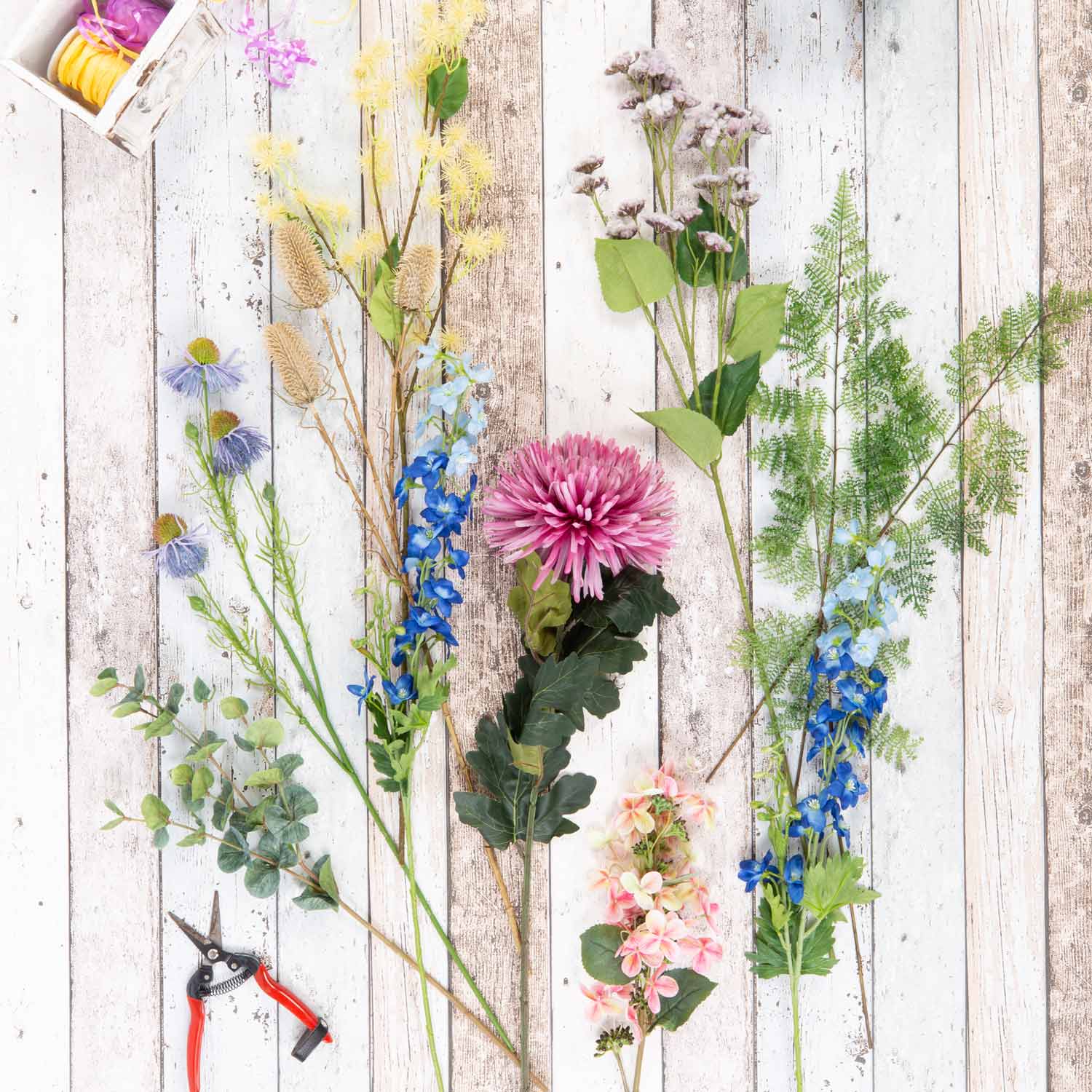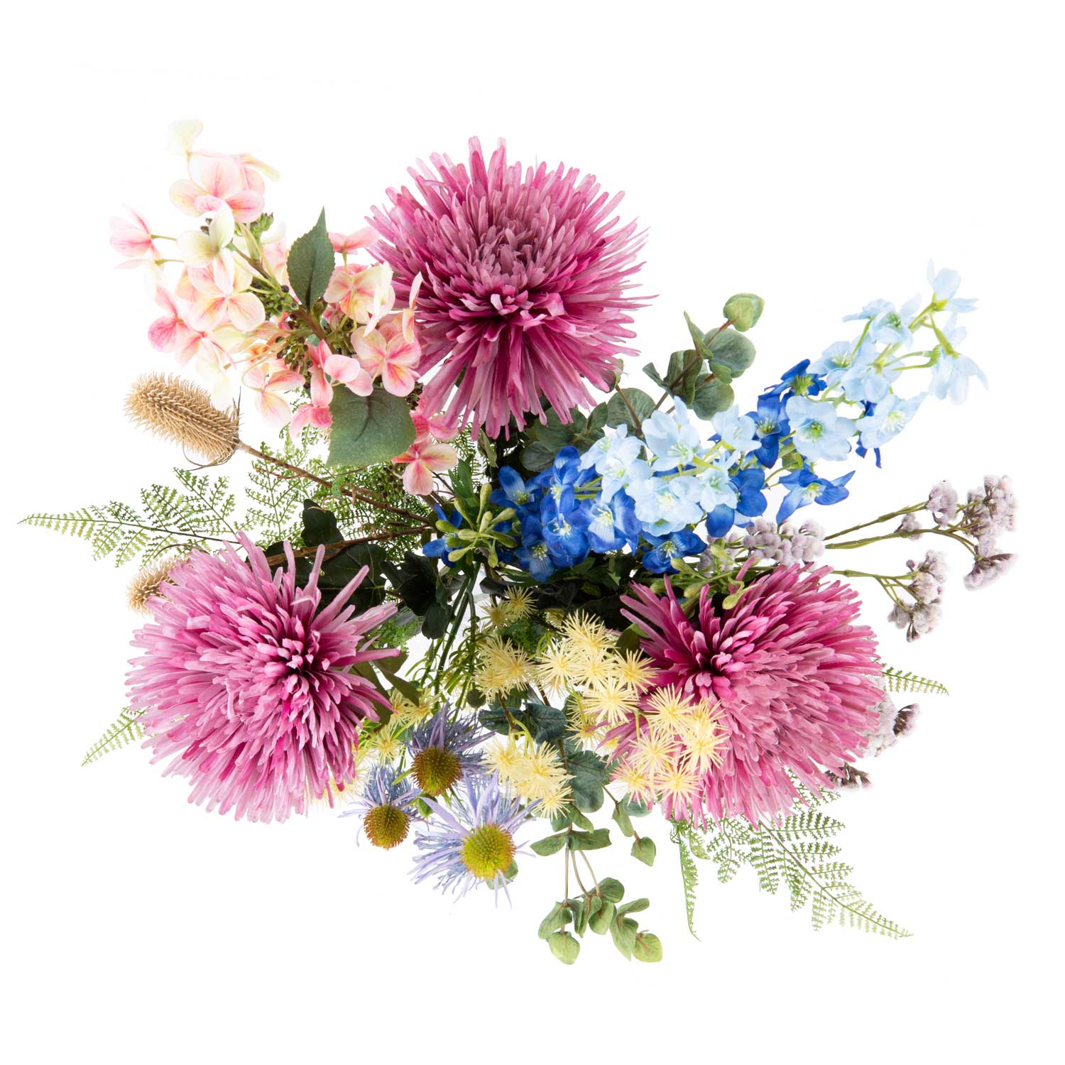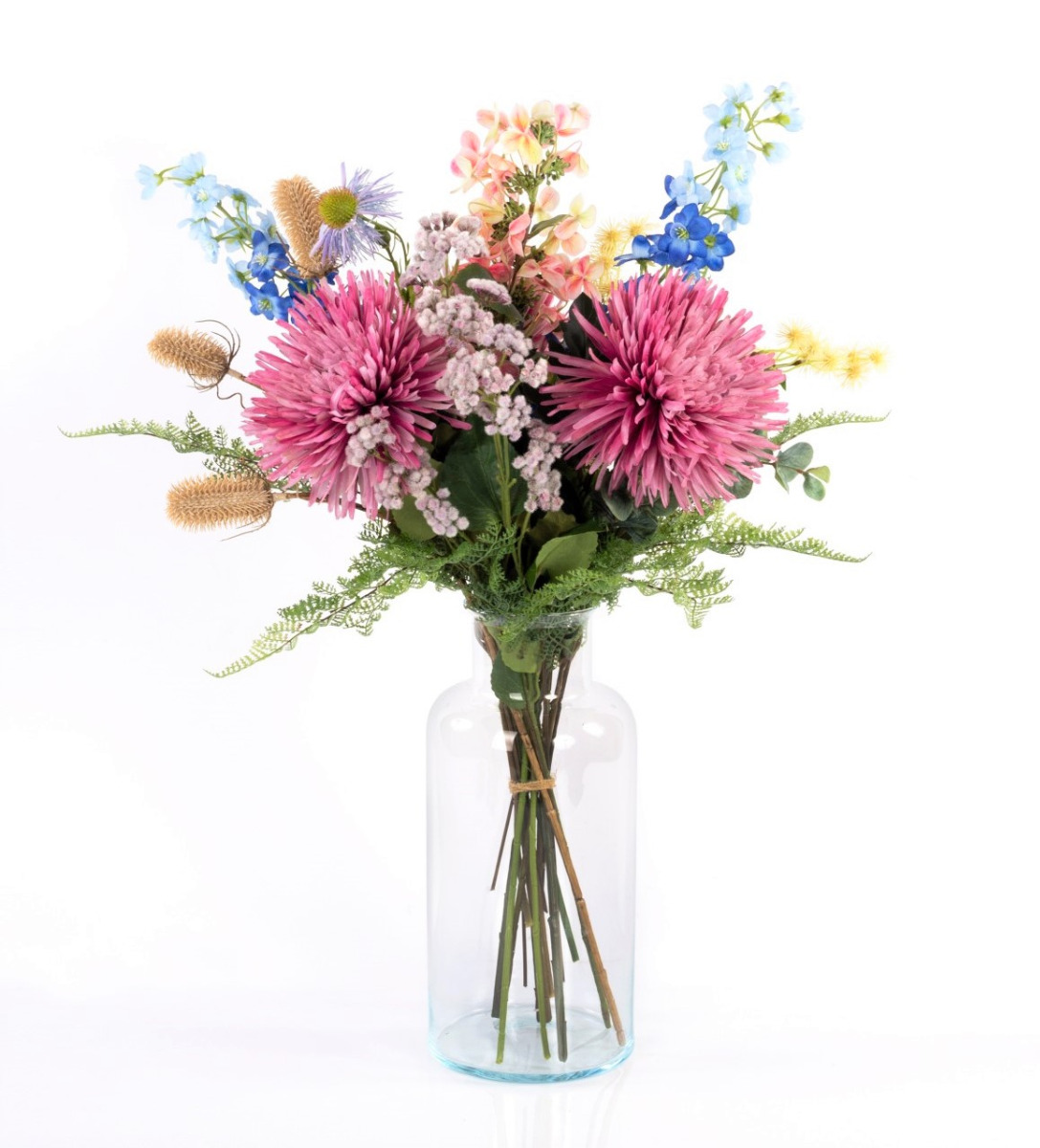Einen bezaubernden Sommergruß stellt dieser künstliche Blumenstrauß LOLANA dar. Neben üppiger Chrysantheme, verspieltem Sonnenhut und freundlicher Wilden Karde ragen Rittersporn und Rispen-Hortensie aus dem Blumenensemble heraus.