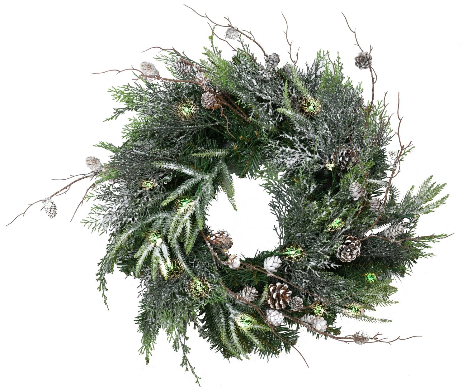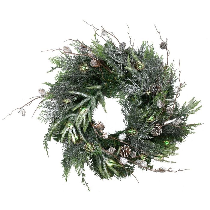 - Beschneiter künstlicher Kranz mit Zapfen und braunen Zweigen sowie vielen LEDs