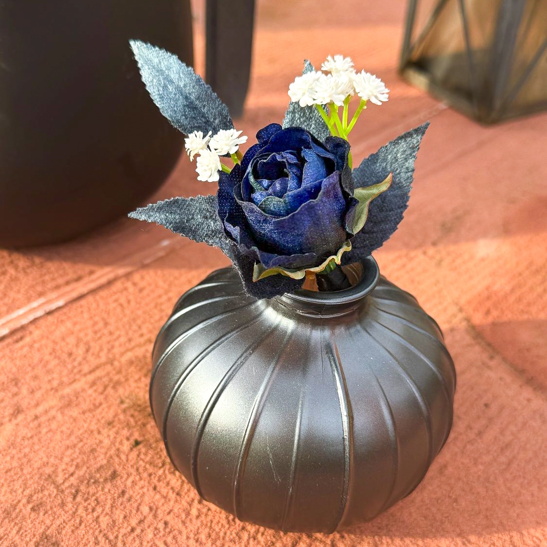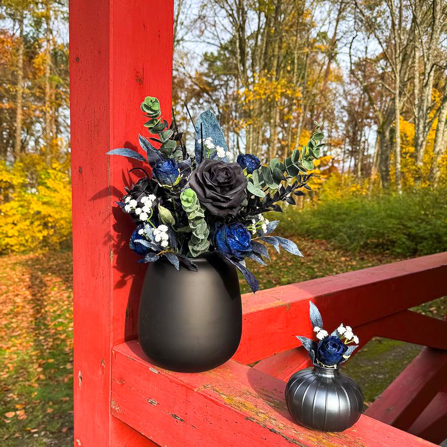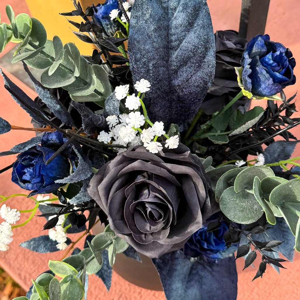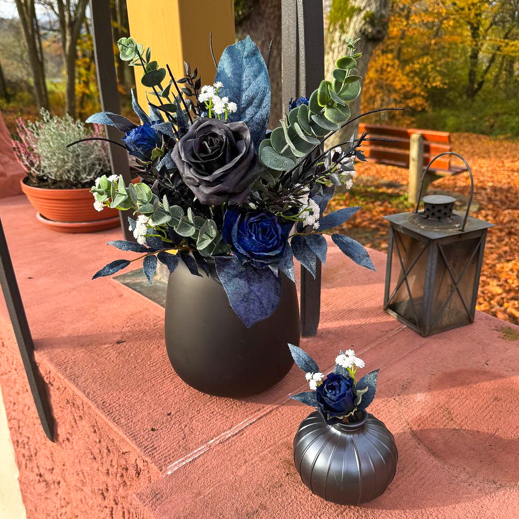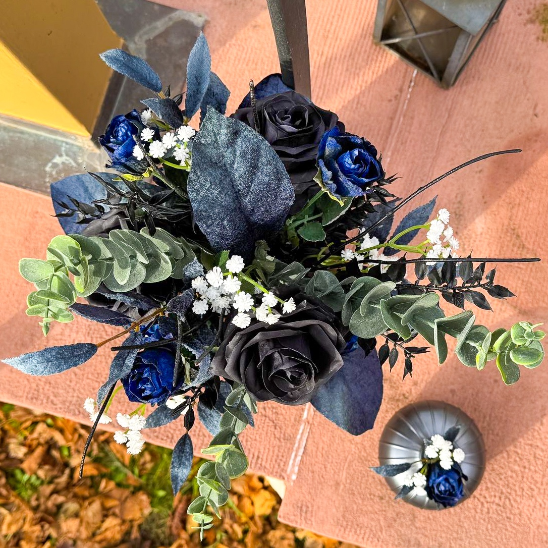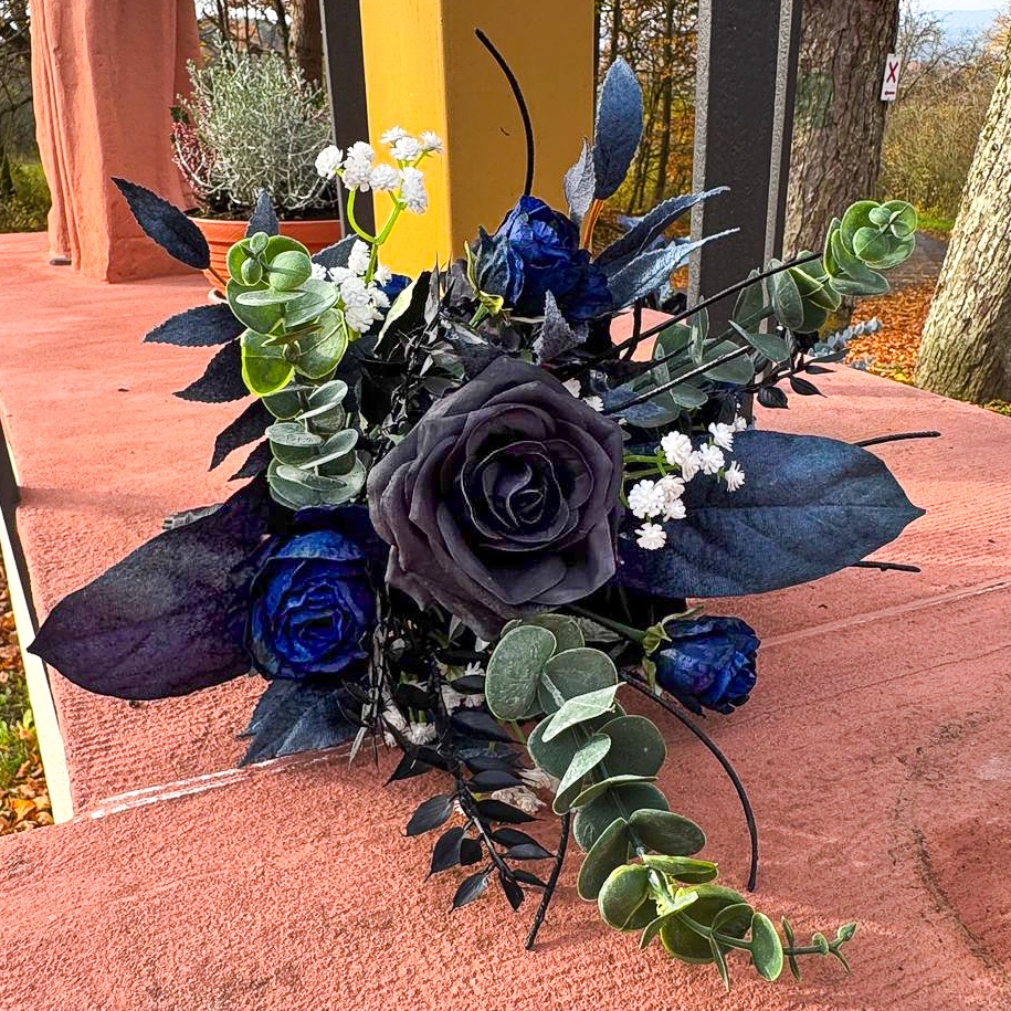 Wenn florale Kunst auf zeitlose Eleganz trifft! Für eine traumhafte Hochzeit in Südfrankreich auf einer idyllischen Halbinsel durften wir die komplette Floristik gestalten. Die Feier fand Mitte November statt – eine Zeit, in der sich Eleganz und Tiefe in der Farbgestaltung besonders wirkungsvoll entfalten. Die Kundin wünschte sich ein modernes, edles Konzept in Schwarz und Dunkelblau, ergänzt durch feine weiße Akzente für einen klassischen Hochzeitseindruck. Alle dunkelblauen Elemente erhielten eine samtige Oberfläche, die besonders in der kühleren Jahreszeit eine edle, warme Wirkung entfaltet. Der Brautstrauß und der passende Anstecker für den Bräutigam bilden das Herzstück des gesamten Floristik-Konzepts – harmonisch aufeinander abgestimmt und stilprägend für alle weiteren Arrangements. Wollen auch Sie Ihre Hochzeit mit künstlichen Blumen feiern? Shop the Look!