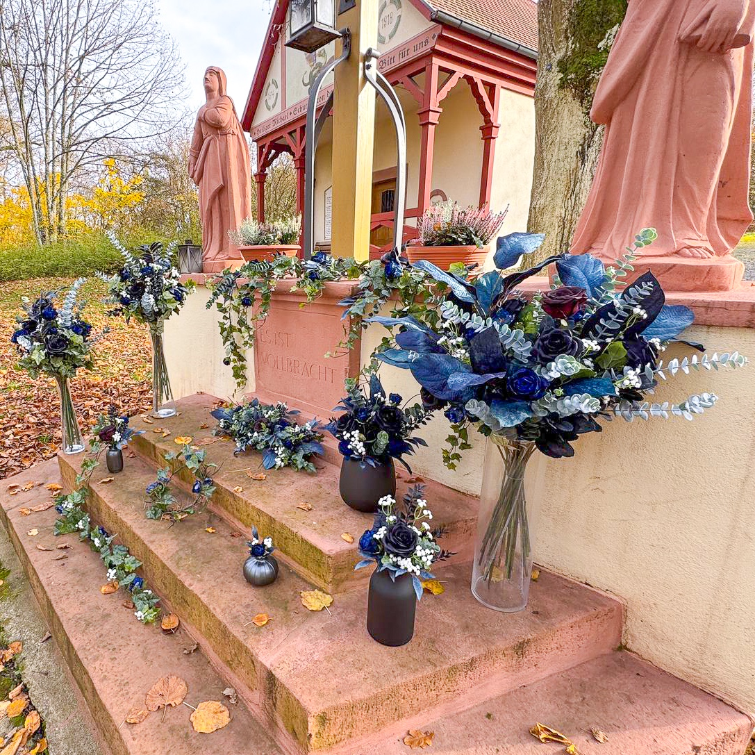 Wenn florale Kunst auf zeitlose Eleganz trifft! Für eine traumhafte Hochzeit in Südfrankreich auf einer idyllischen Halbinsel durften wir die komplette Floristik gestalten. Die Feier fand Mitte November statt – eine Zeit, in der sich Eleganz und Tiefe in der Farbgestaltung besonders wirkungsvoll entfalten. Die Kundin wünschte sich ein modernes, edles Konzept in Schwarz und Dunkelblau, ergänzt durch feine weiße Akzente für einen klassischen Hochzeitseindruck. Alle dunkelblauen Elemente erhielten eine samtige Oberfläche, die besonders in der kühleren Jahreszeit eine edle, warme Wirkung entfaltet. Wollen auch Sie Ihre Hochzeit mit künstlichen Blumen feiern? Shop the Look!