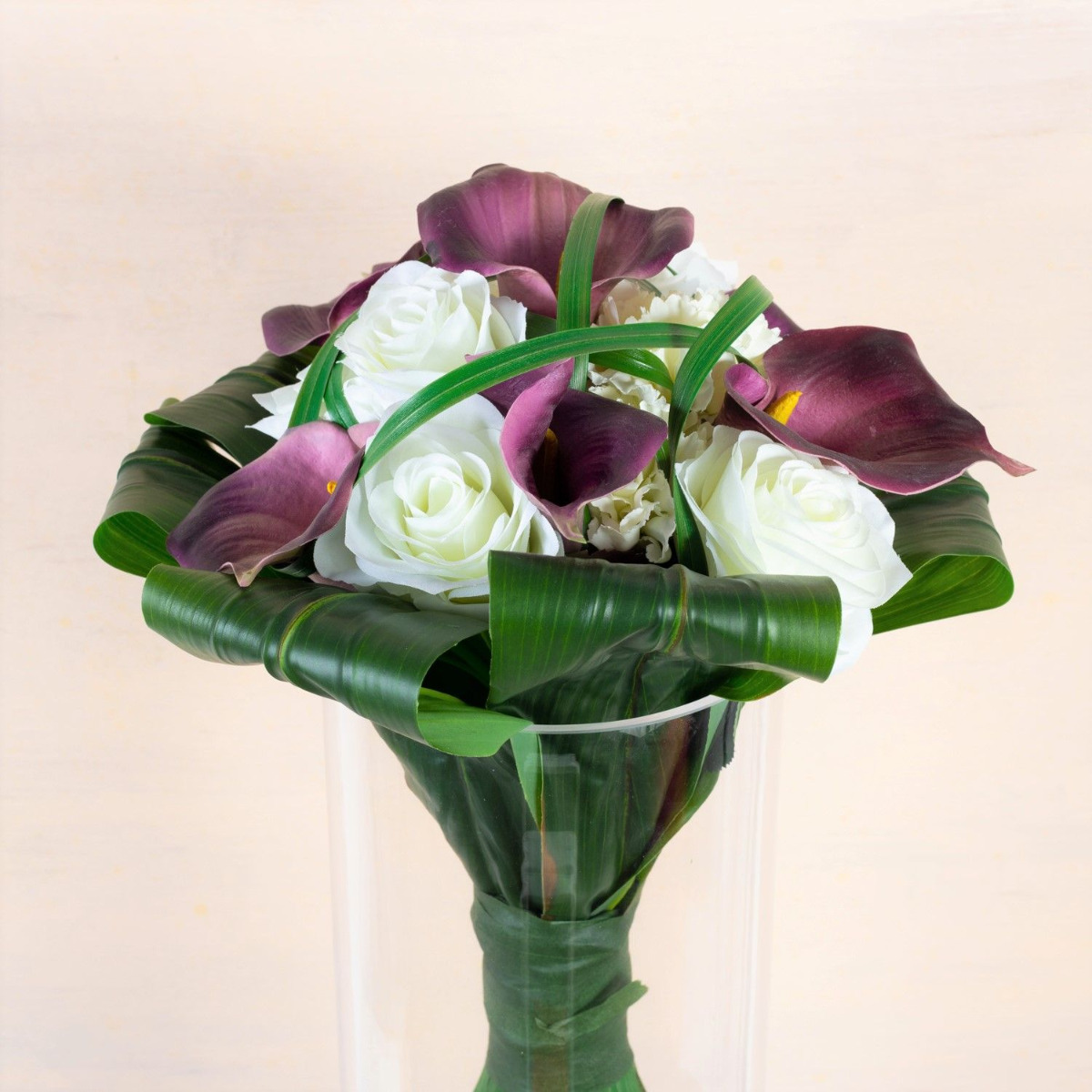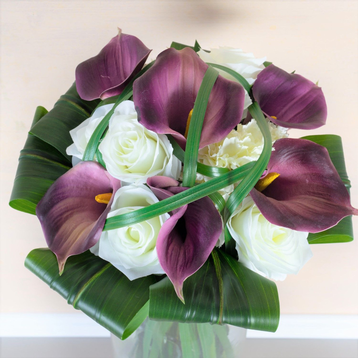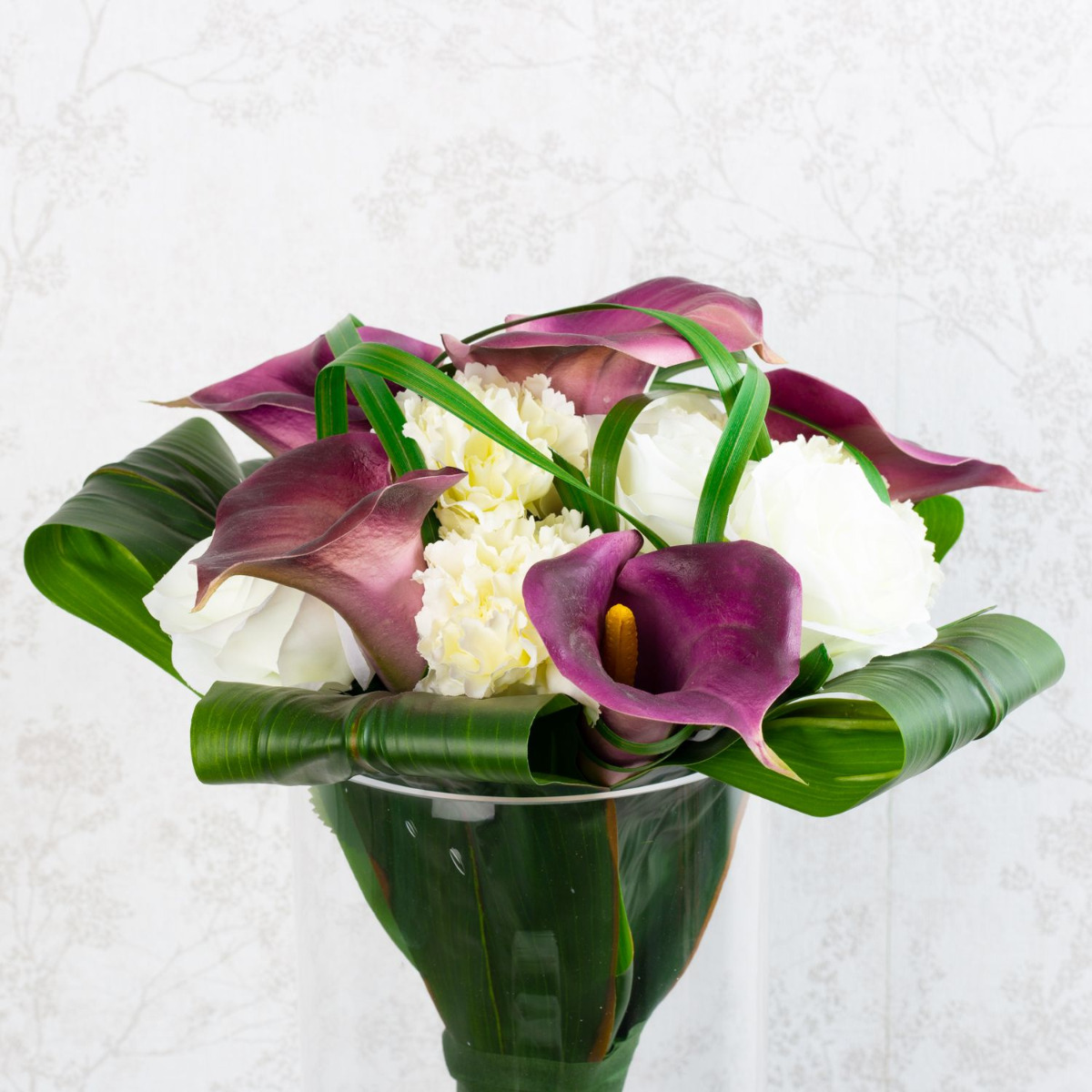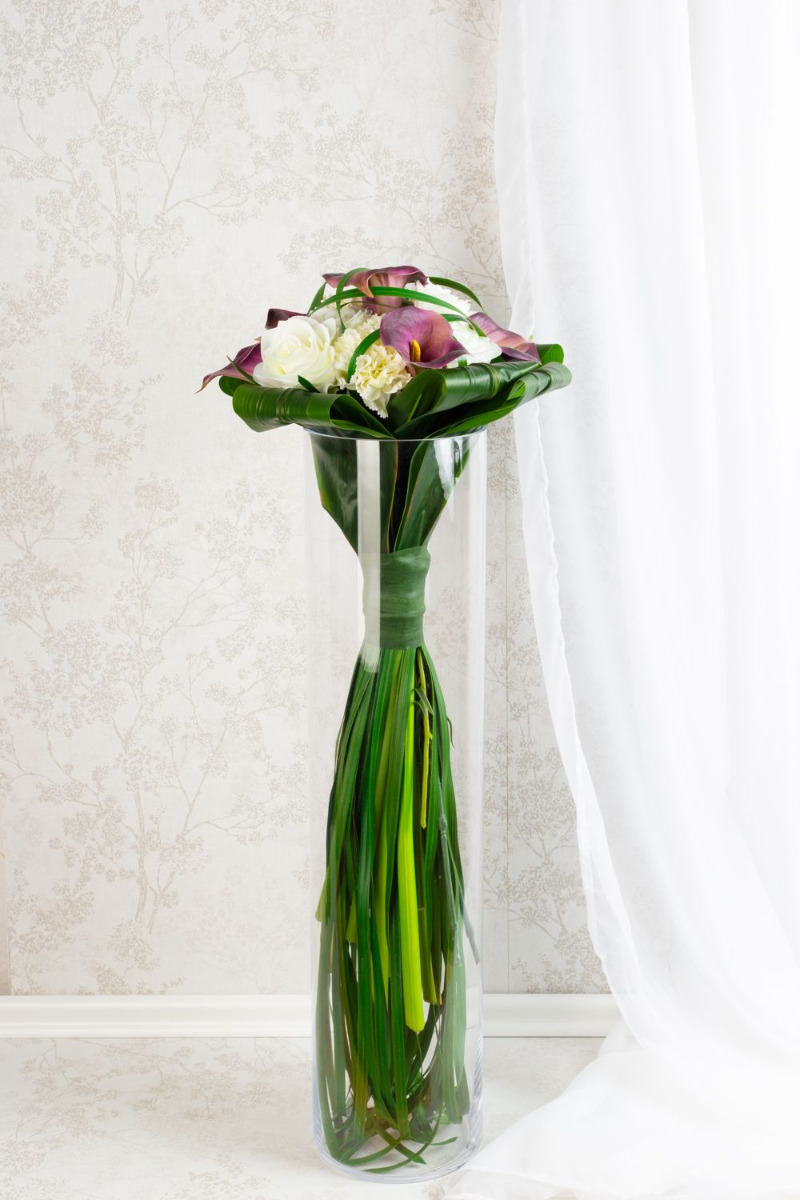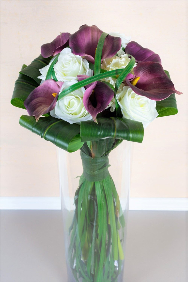 Der Hochzeitsstrauß für die Ewigkeit! Per Telefon kontaktierte uns Janine. Sie erzählte uns von Ihrem Brautstrauß und dem Wunsch diesen als Andenken an ihren großen Tag aus künstlichen Blumen nachzubinden. Sie schickte uns ein Foto ihres extravaganter Zepter- / Stabstraußes. Wie für diese Art von Strauß typisch, präsentierte er sich mit auffällig langen Stielen und Grashalmen, die durch ein breites eng geschürtes Band ein Zepter formen. Die Wahl der verwendeten Blumen fiel auf edle Callas, klassische Rosen und weiße Nelken als Zeichen der Treue. Für eine Umrahmung sorgten umgeschlagene Keulenlilien Blätter. Die Auswahl an künstlichen Blumen konnte wir wie beschrieben übernehmen. Das Binden unseres ersten Zepterstraußes stellte uns zunächst vor eine Herausforderung. Aufgrund der glatten künstlichen Oberfläche verrutschten die Blätter beim Zusammenbinden. Die Grashalme konnten ebenfalls nur mühsam Halm für Halm eingebunden werden. Stolz präsentierten wir Janine unseren ersten Vorschlag. Sie war begeistert von unserer Arbeit, wünschte sich jedoch kleinere Blüten, da diese im Original auch nicht so groß waren. Rosen und Nelken fanden sich schnell im Lager, eine andere violette Calla gab es jedoch nicht in unserem Sortiment. Daraufhin durchsuchten wir zahlreiche Lieferantenlisten nach einer solchen Blume. Dies nahm zwar viel Zeit in Anspruch, wurde abschließend, aber positiv belohnt. Kurzerhand bestellten wir die kleine Calla und ergänzten sie in unserem Sortiment. Durch den Austausch der Blüten verlor der Blumenstrauß prompt an Durchmesser. Nun entsprach auch die Größe dem Original, wodurch wir auch bei dieser Kundin die Zustimmung des Auftrages erhielten. Wollen auch Sie einen künstlichen Hochzeitsstrauß für die Ewigkeit? Shop the Look!