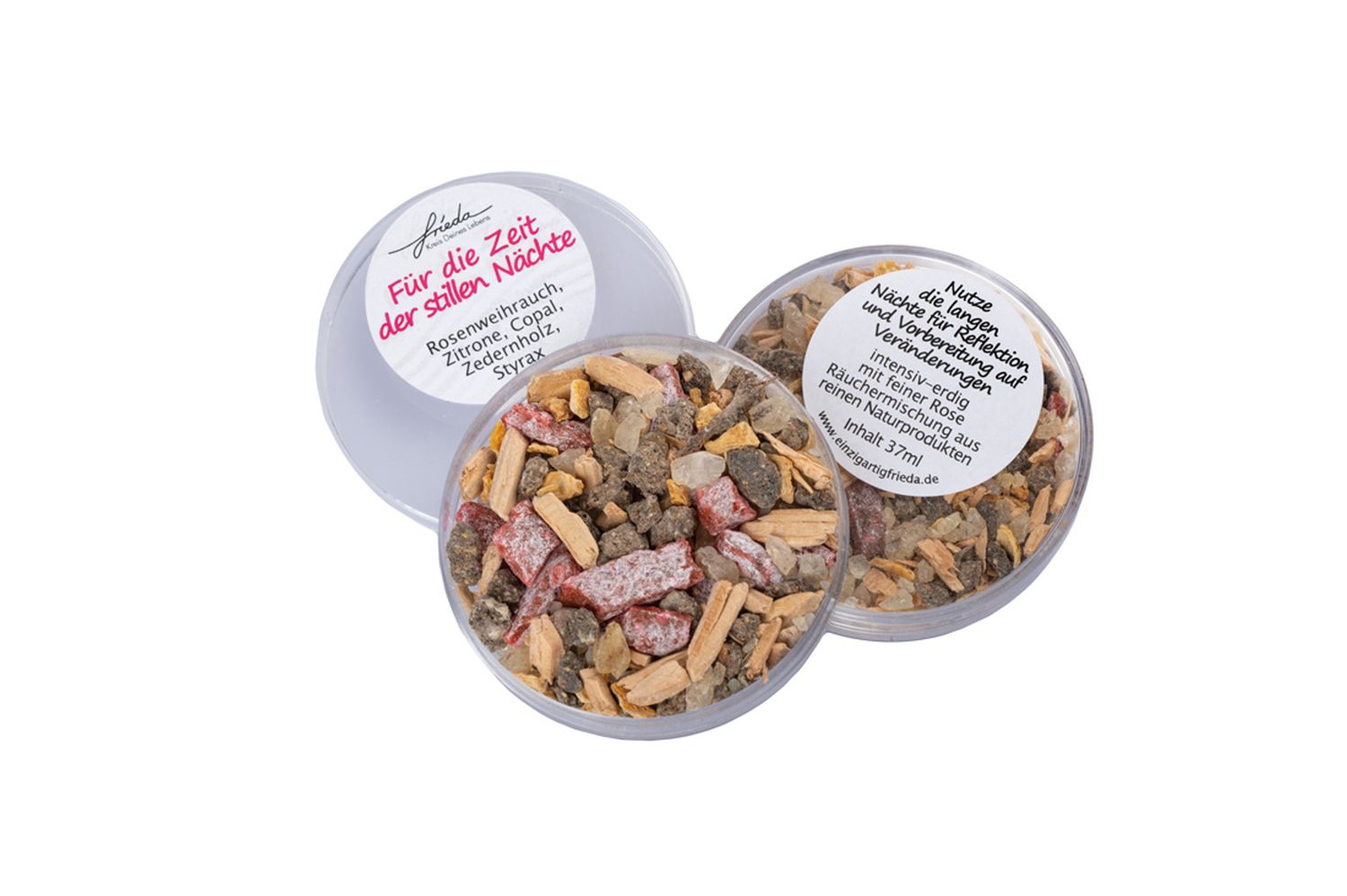 - Für die Zeit der stillen Nächte; bestehend aus Rosenweihrauch, Zitrone, Copal, Zedernholz und Styrax
