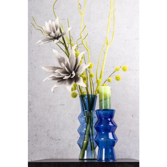 Neongrün und Blau! Diese leuchtenden Farben erhellen das Grau des Alltags und erfrischen jeden Raum. Die graue, melancholisch wirkende Kunststoffschaumlilie wird durch das Beiwerk modern und elegant. Der neongrüne Mitsumatazweig und die gleichfarbigen Ballon-Wolfsmilch erschaffen in Kombination mit den blauen Vasen eine ungewöhnliche Farbkombination, die altbewährtes auf eine neue Weise darstellt. Besonders beachtenswert sind die blauen Vasen, die mit ihrer besonders geformten Silhouette ein echter Blickfang sind. Erhellen auch Sie Ihr Zuhause mit dieser avantgardistischen Zusammenstellung. Shop the Look!