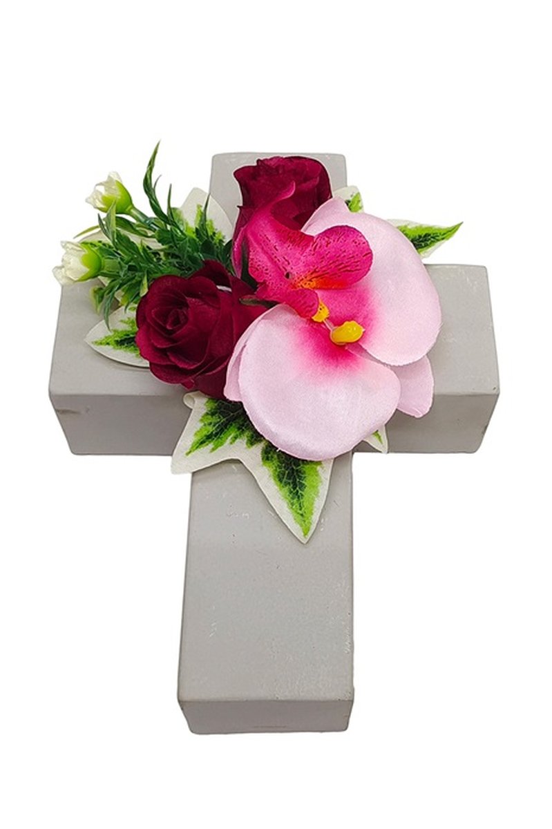- Das geschmackvolle Blumengesteck auf einem Kreuz ist eine schöne Bereicherung z.B. für den Grabschmuck, bitte beachten Sie das wir für die Verwendung im Außenbereich keine Garantie auf die Langlebigkeit und Beständigkeit geben können, die Kunstblumen können sich durch die UV-Strahlung verfärben, brüchig werden oder durch Wind abreißen!