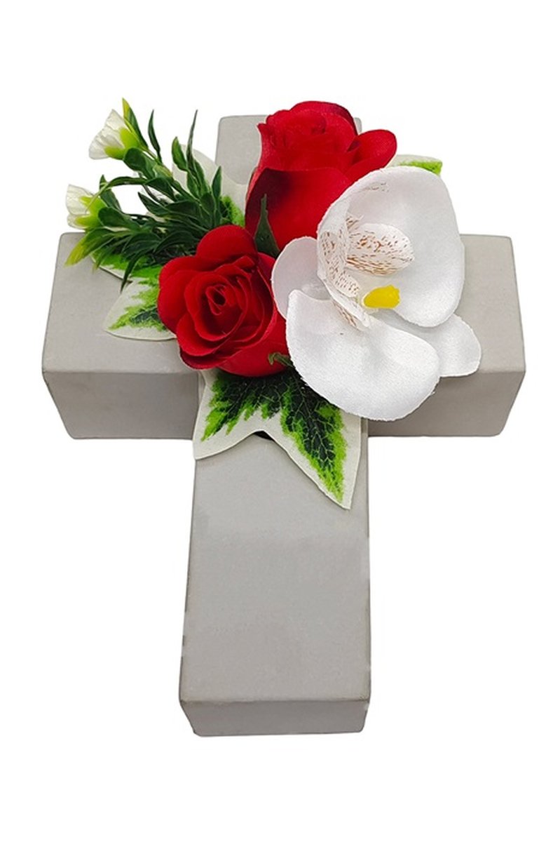 - Das geschmackvolle Blumengesteck auf einem Kreuz ist eine schöne Bereicherung z.B. für den Grabschmuck, bitte beachten Sie das wir für die Verwendung im Außenbereich keine Garantie auf die Langlebigkeit und Beständigkeit geben können, die Kunstblumen können sich durch die UV-Strahlung verfärben, brüchig werden oder durch Wind abreißen!
