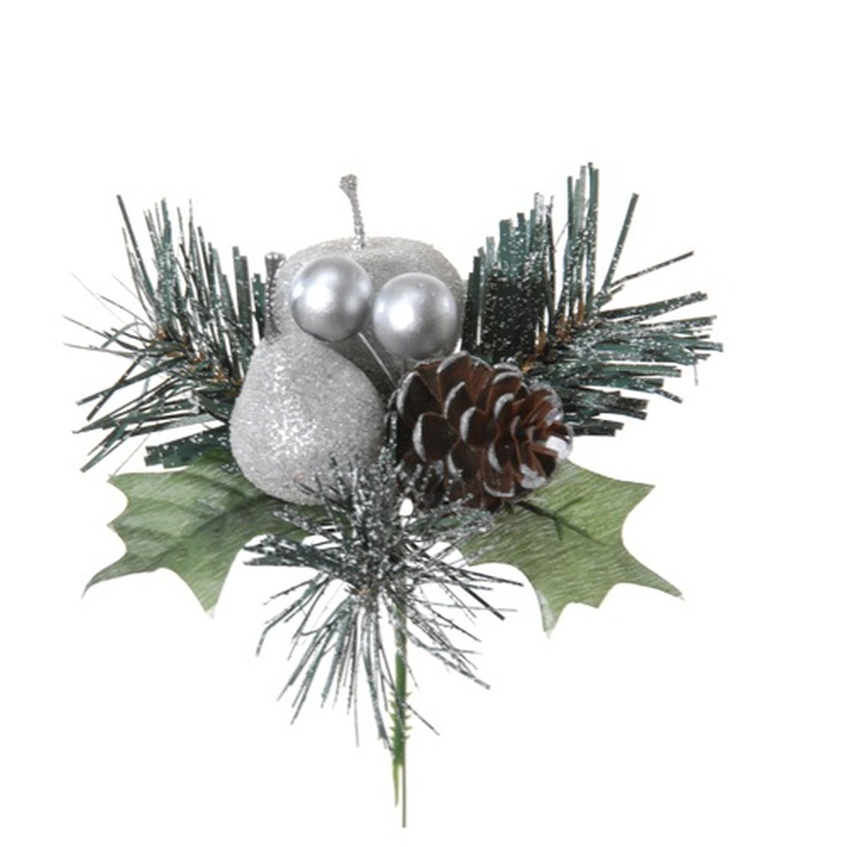 Plastik Gesteck Apfel, Birne, Kiefer HERMOSA mit Kugeln, Steckstab, silber, 20cm, Ø12cm