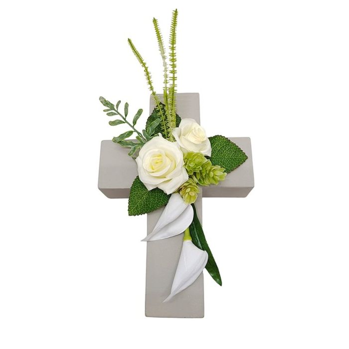 Plastik Gesteck Rose, Calla, Hopfen LONNE, Pflanzkreuz, weiß-grün, 35x18x10cm