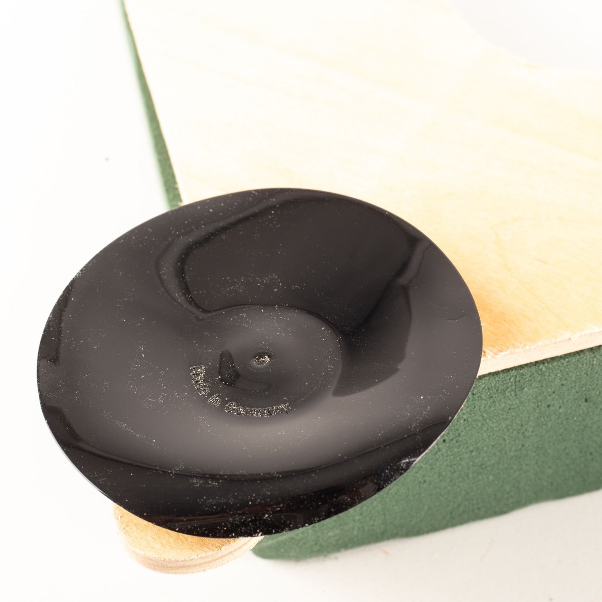 - Auf umweltfreundlicher Naturholz-Unterlage mit drei Saugnäpfen zur Fixierung auf z.B. einer Motorhaube