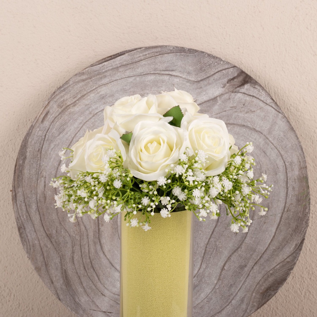 Gestaltungstipp: 4 Rosen werden in die Mitte des Bouquets gesetzt und außenherum die weiteren 8 Rosen angeordnet. Es soll ein symmetrisches, kompaktes Bild mit einer Wölbung in der Mitte entstehen. Das ist die Form eines klassischen Brautstraußes. Das Schleierkraut um die Rosen herumbinden. Alles auf gleiche Längen kürzen und mit einem Satinband fest umwickeln. Sodass der klassische „Griff“ eines Brautstraußes entsteht. Ende des Satinbandes mit einer Stecknadel befestigen.