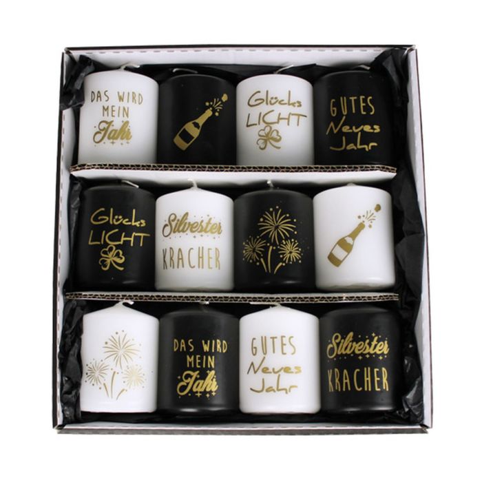 Silvester Stumpenkerzen OVILA, 12 Stück, schwarz-weiß-gold, 8cm, Ø6cm - Made in Germany