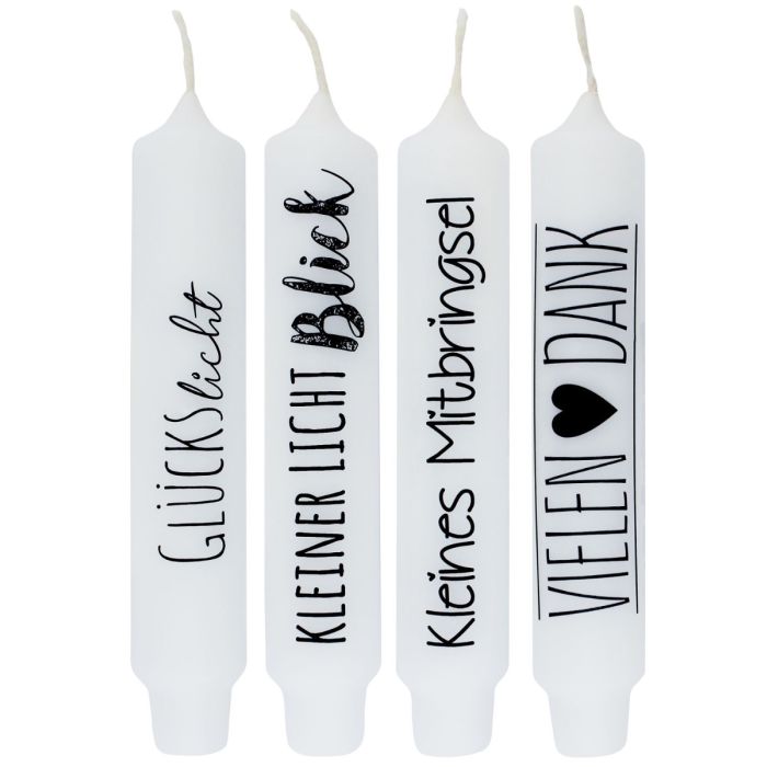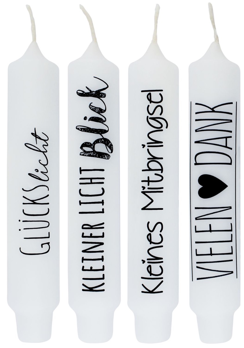 - In Farbe weiß mit schwarzer Schrift, insgesamt 4 Kerzen mit verschiedenen Sprüchen, Lieblingsmensch: Von Herzen, Lieblingsmensch, Für die allerbeste Mama, Für den allerbesten Papa