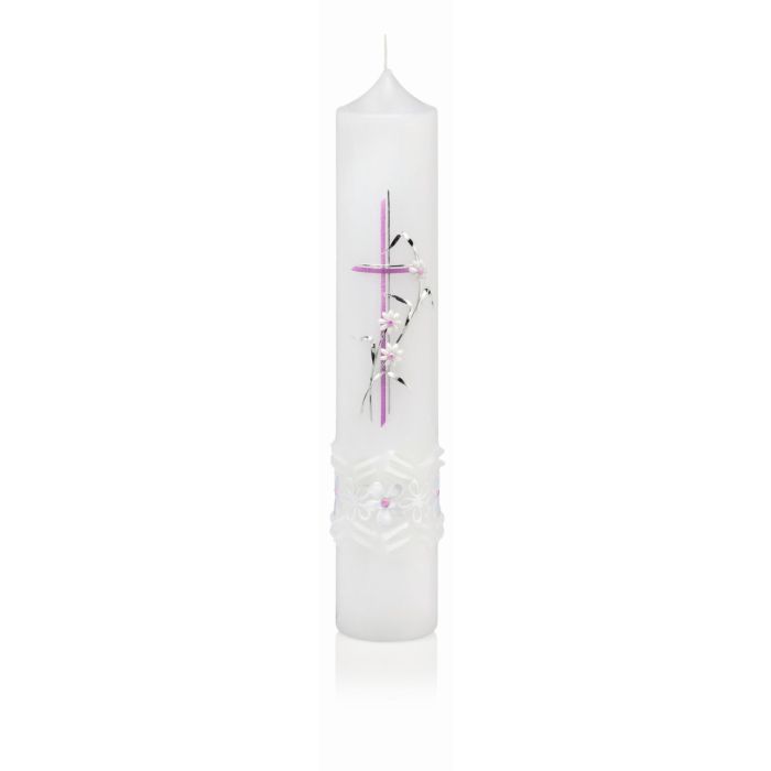 Taufkerze Kommunionkerze Konfirmationskerze OTTILIE, verziert, weiß-silber-pink, 26,5cm, Ø5cm - Made in Germany
