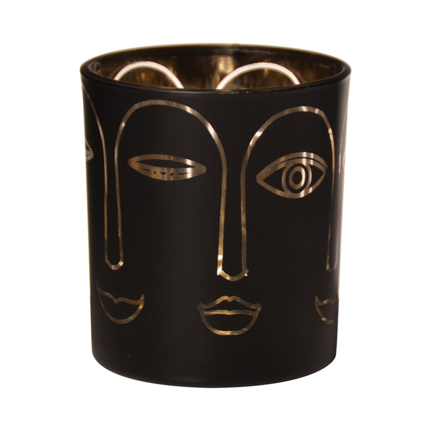 Teelichthalter Glas LEOLINE mit Gesichtern, schwarz-gold, 8cm, Ø7cm