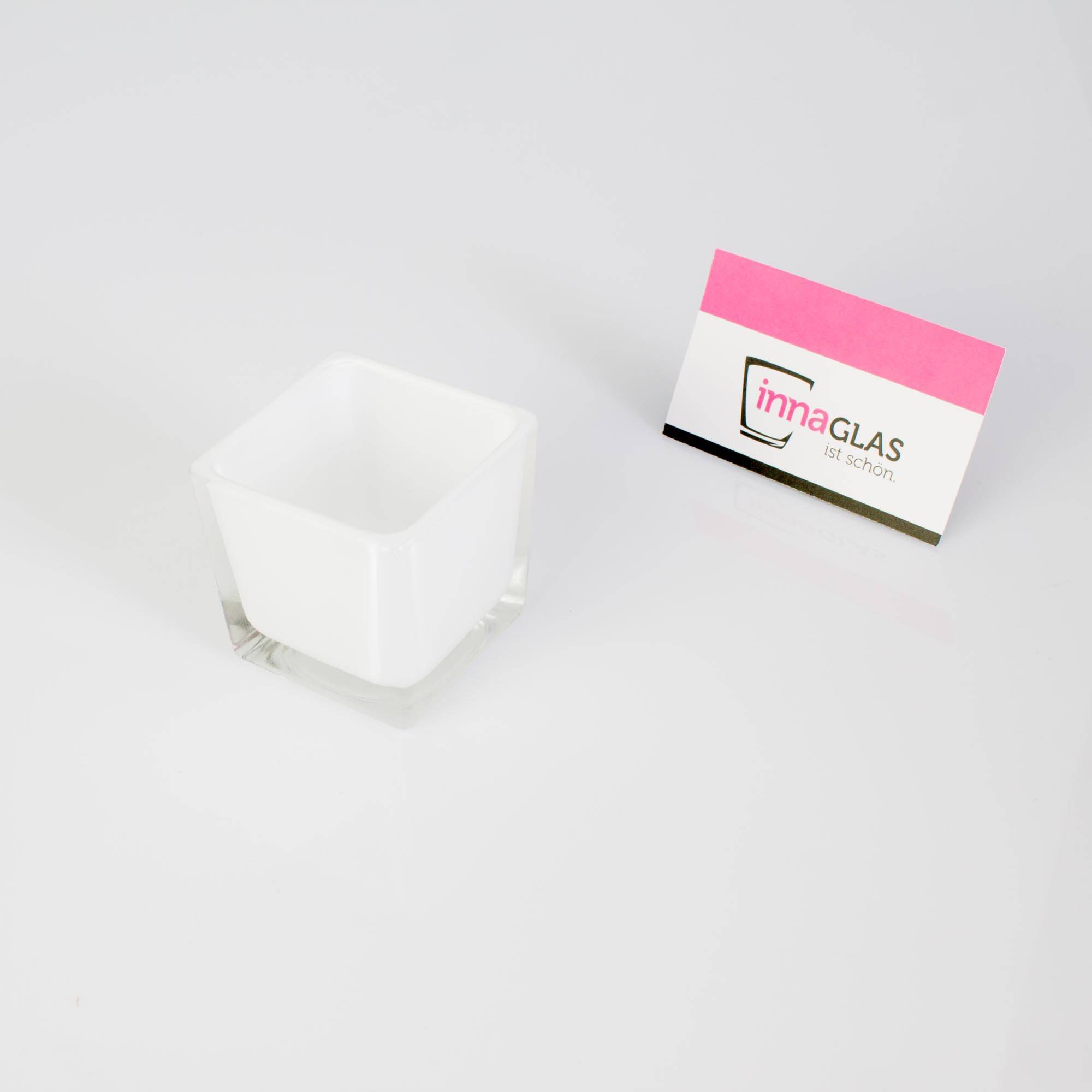 Kleines eckiges Windlicht Glas KIM mit den Maßen 6 x 6 x 6 cm. In diesem kleinem Windlicht Glas von INNA Glas fühlt sich Ihr Teelicht wie zu Hause.