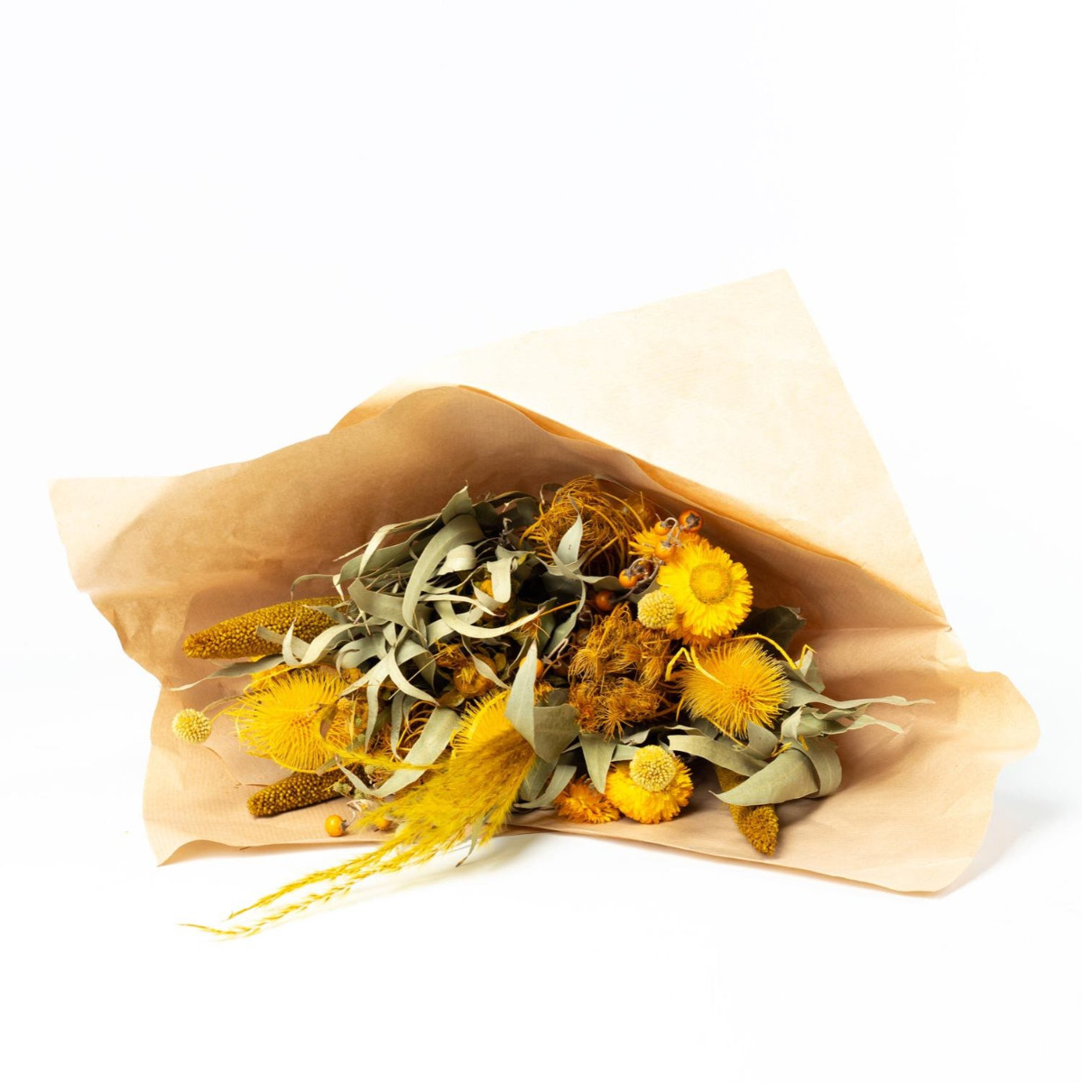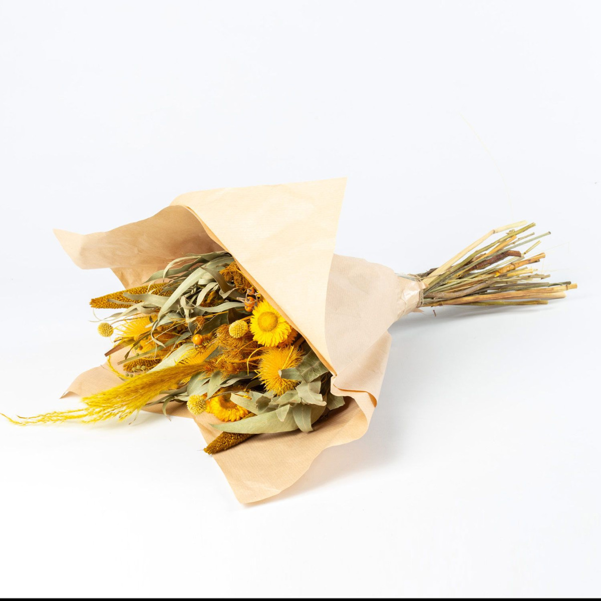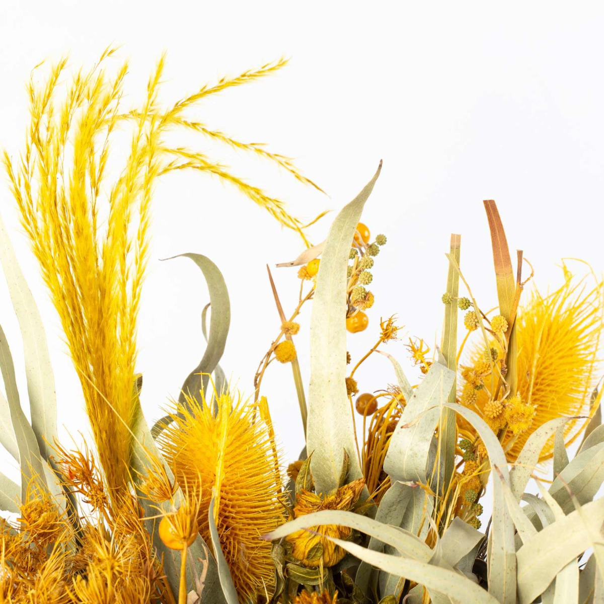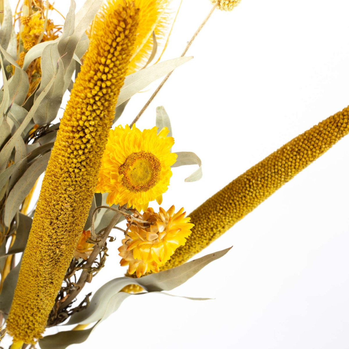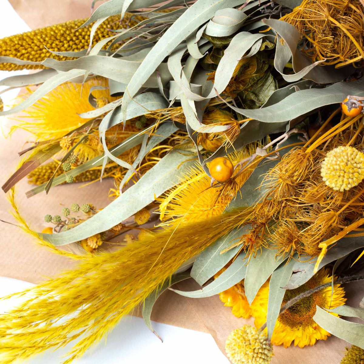 - Trockenstrauß aus verschiedenen getrockneten Blumen in Farbe gelb-grün