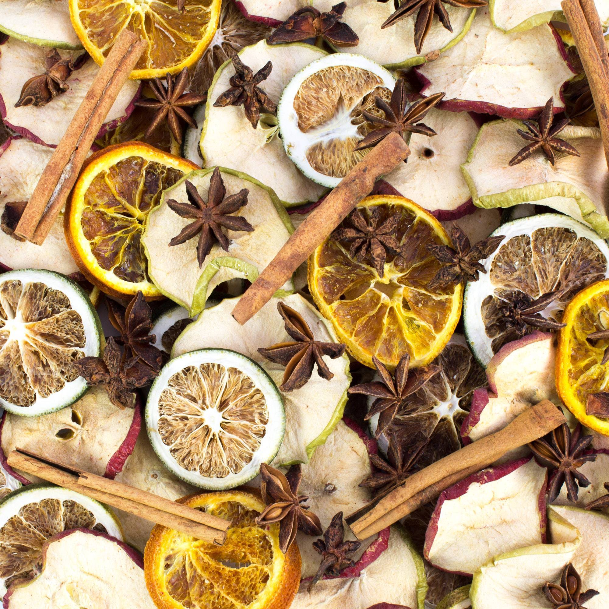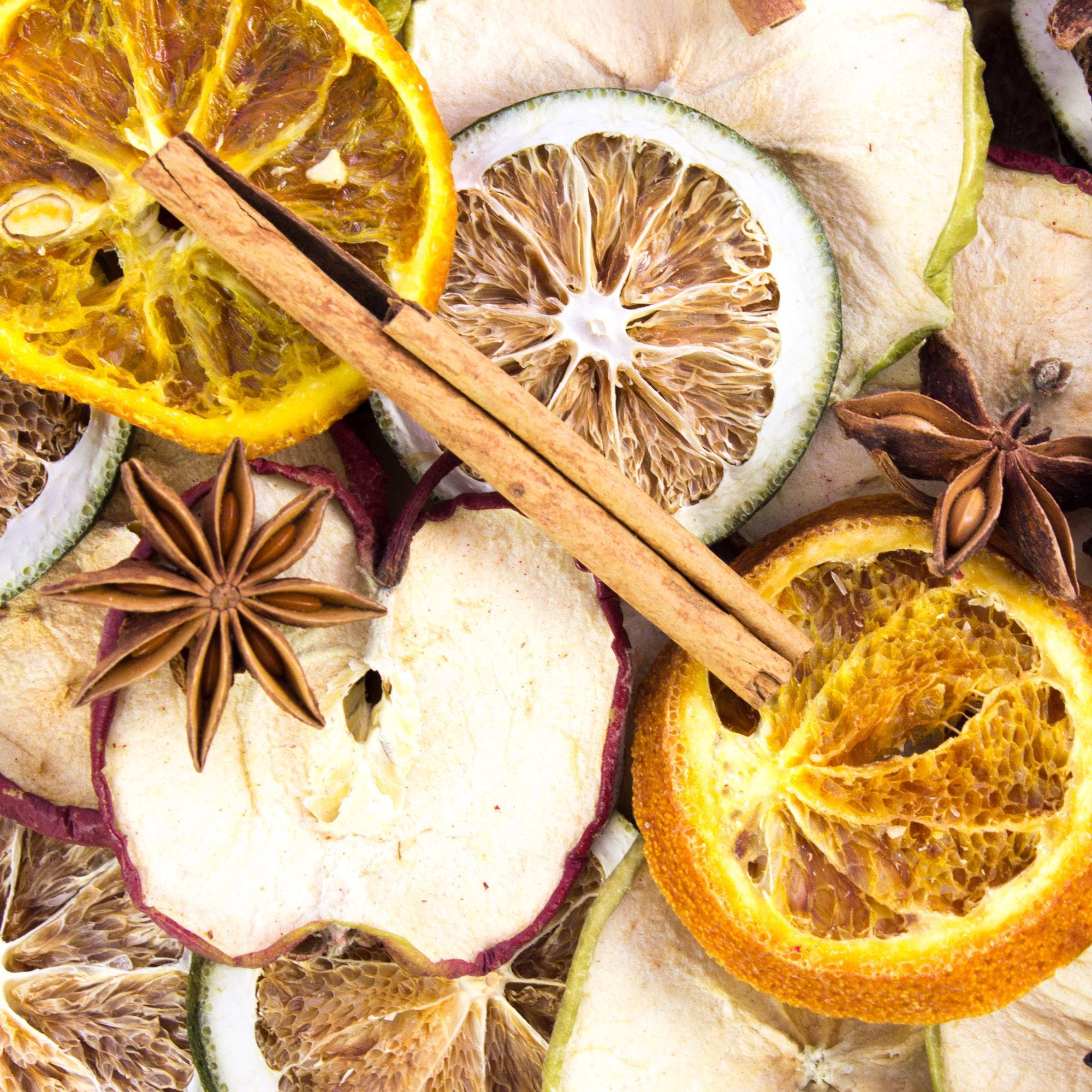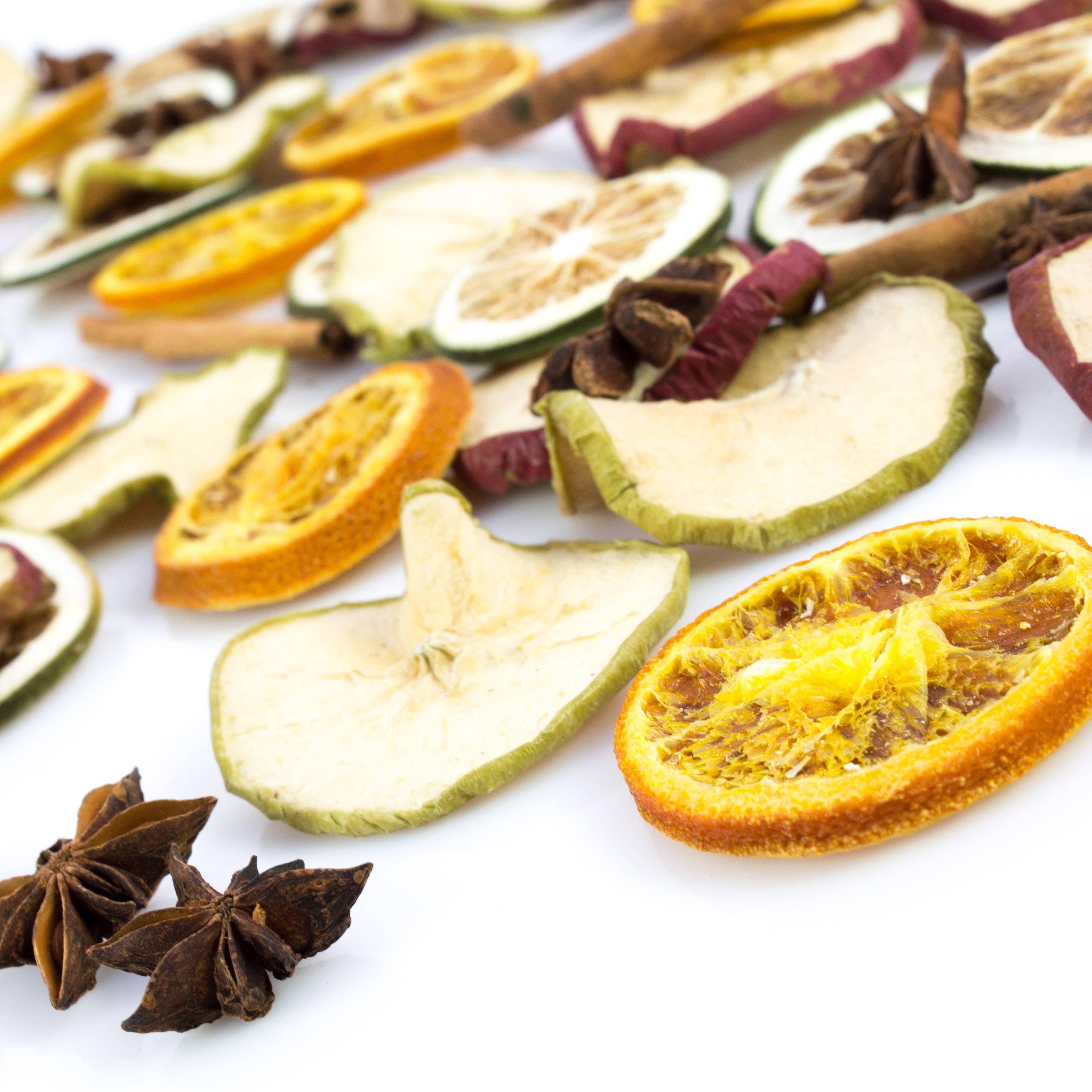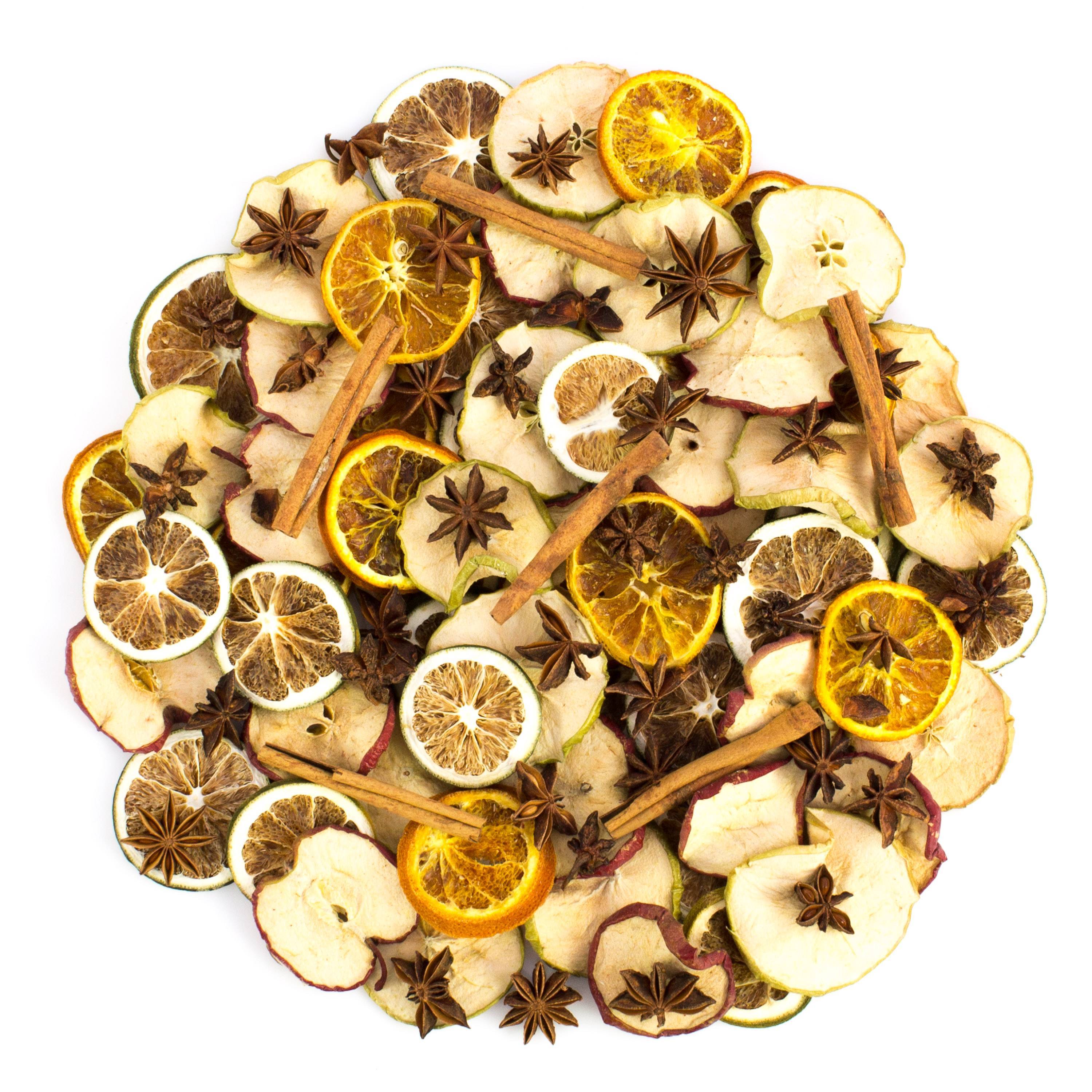 Getrockneter Früchtemix aus Orange-, Limetten-, roten und grünen Apfelscheiben mit Zimtstangen und Sternanis verfeinert. Die Trockenfrüchte mit Ihrer naturbelassenen Farbe wirken als Streudekoration auf Tischteller oder in Flachschalen.