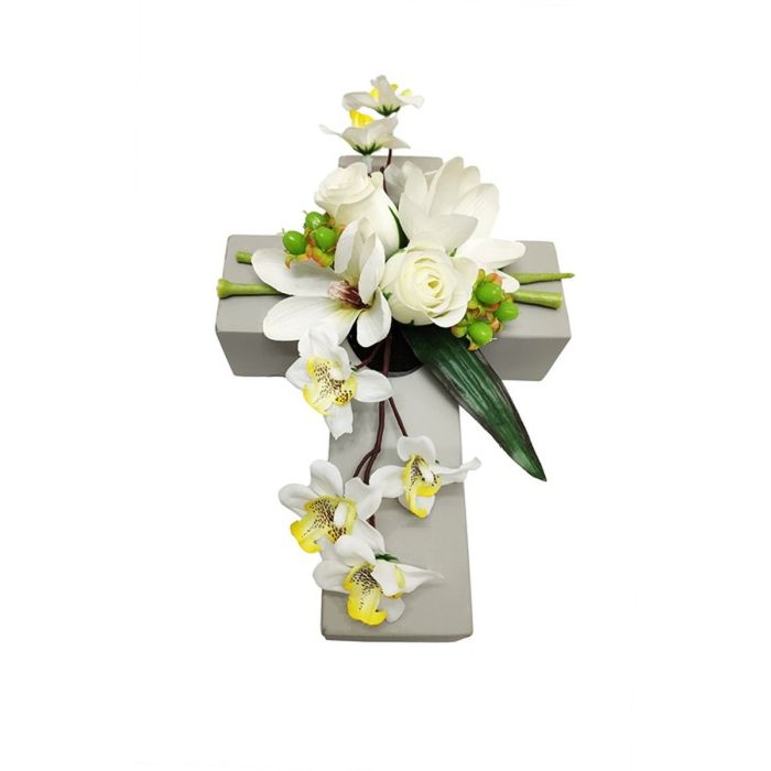Unechtes Blumen Gesteck Magnolie, Orchidee, Rose OVANA, Pflanzkreuz, weiß, 28x18x10cm