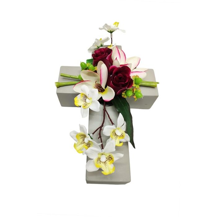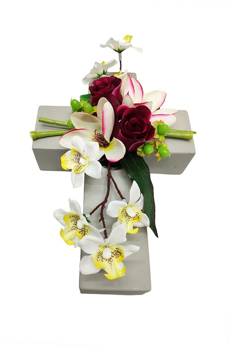 Das künstliche Gesteck OVANA ist auf einem Kreuz aus Beton befestigt. Es eignet sich perfekt z.B. für die Gestaltung einer Gedenkecke, oder Sie verwenden es als Grabschmuck. Bitte beachten Sie das wir für die Verwendung im Außenbereich keine Garantie auf die Langlebigkeit und Beständigkeit geben können, die Kunstblumen können sich durch die UV-Strahlung verfärben, brüchig werden oder durch Wind abreißen!