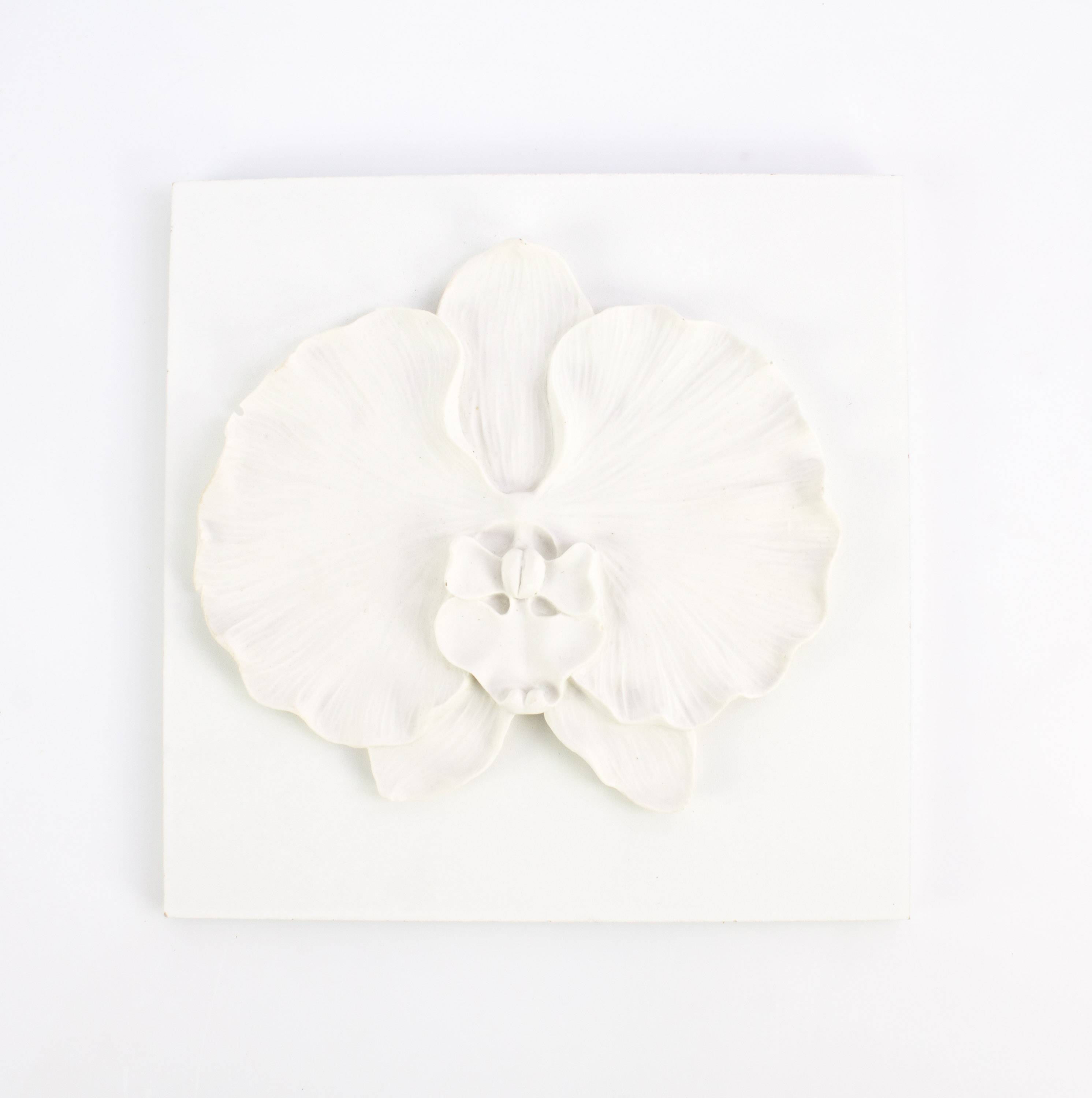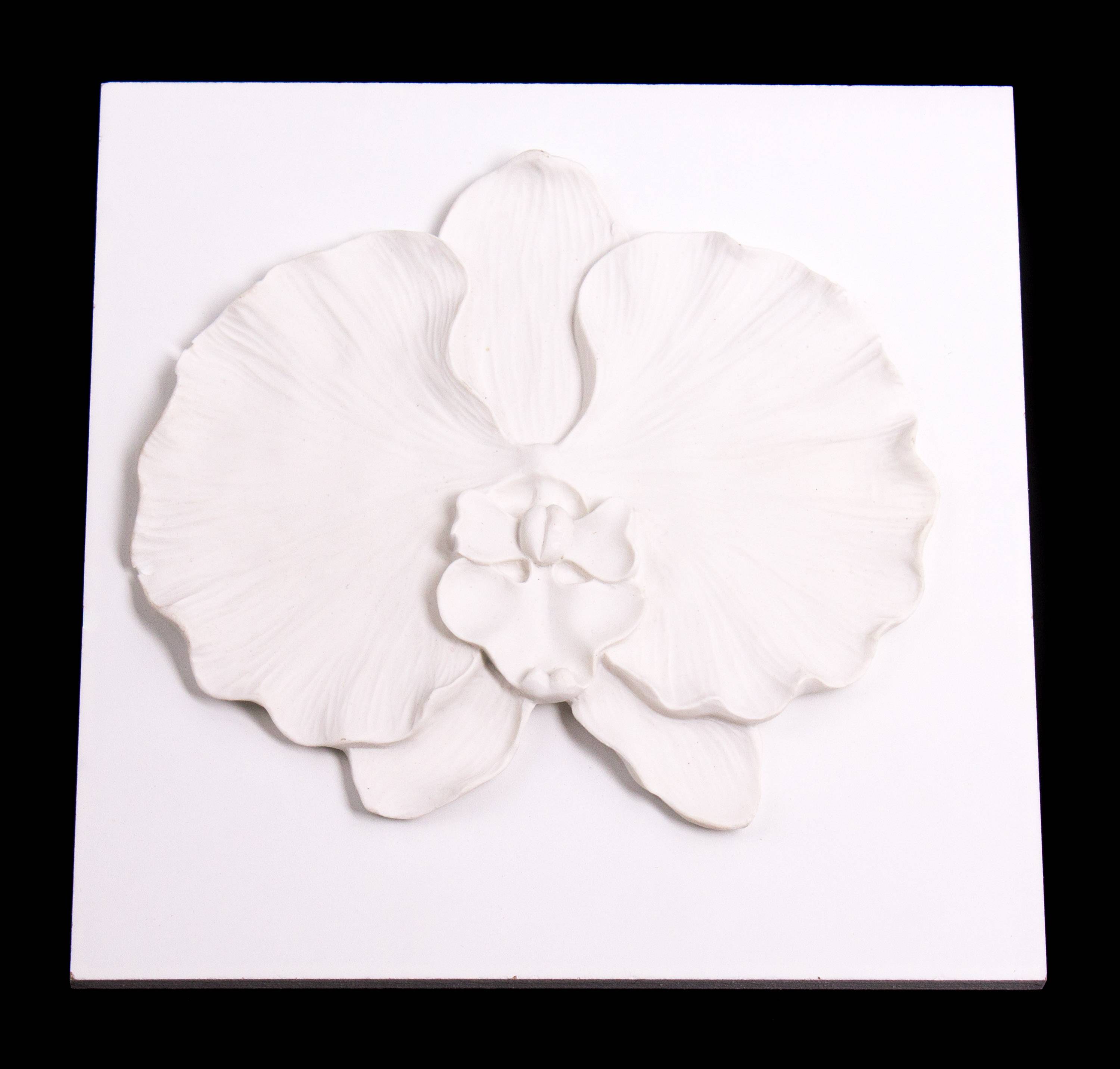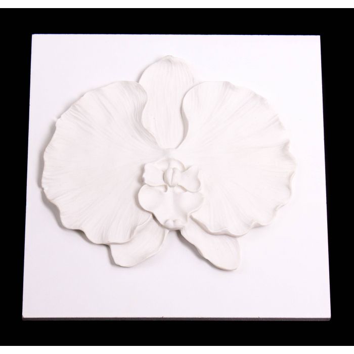 - Rückwand aus weiß lackiertem Dekoholz mit einer großen Orchideen Blüte in Farbe weiß, die draufgesetzte Blüte ist mit der Rückwand fest verbunden, dadurch ergibt sich ein 3d Effekt