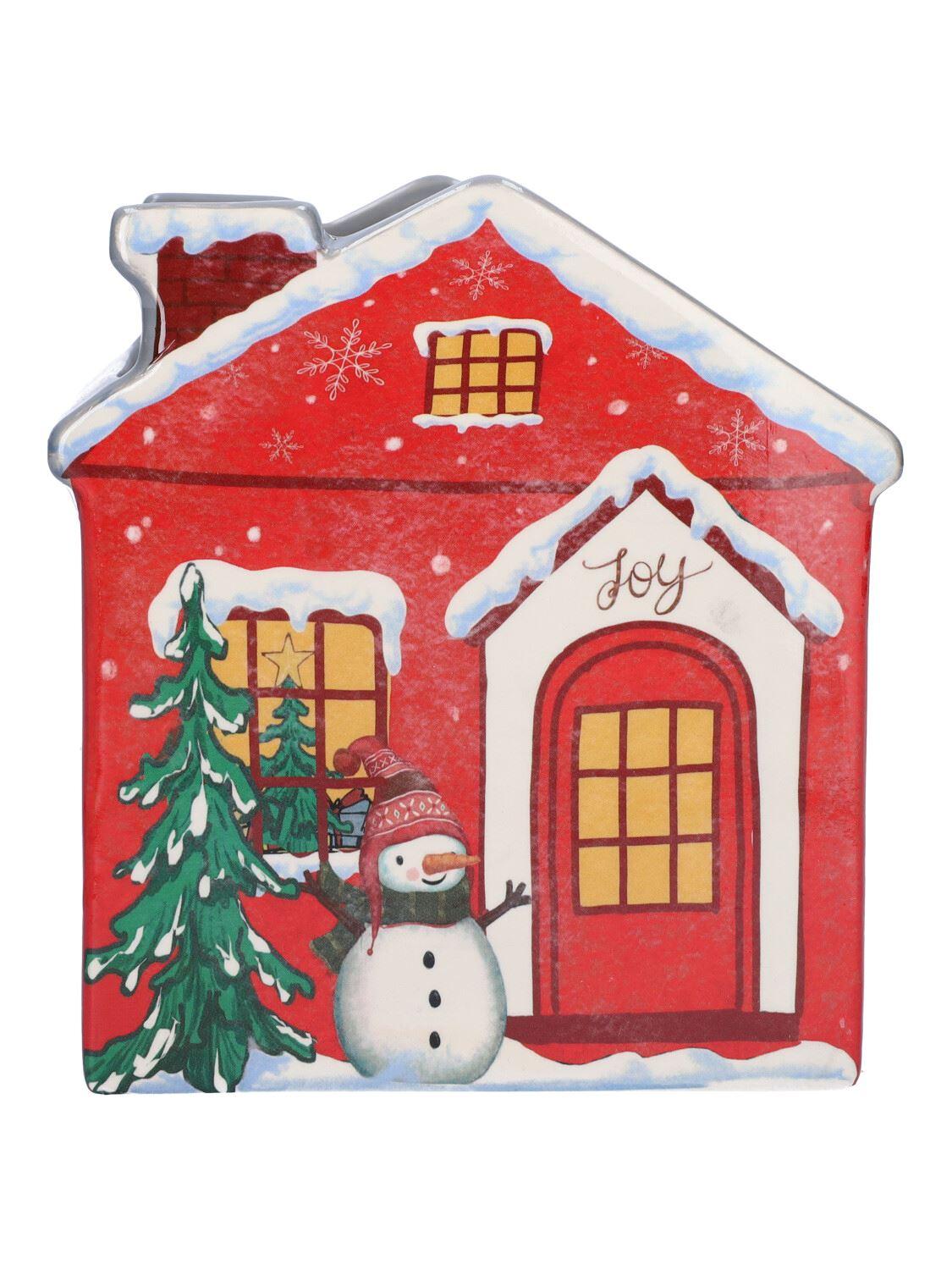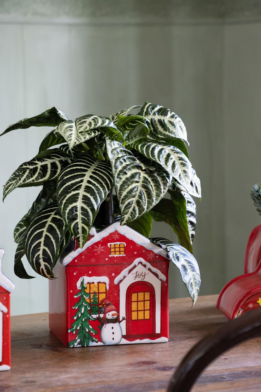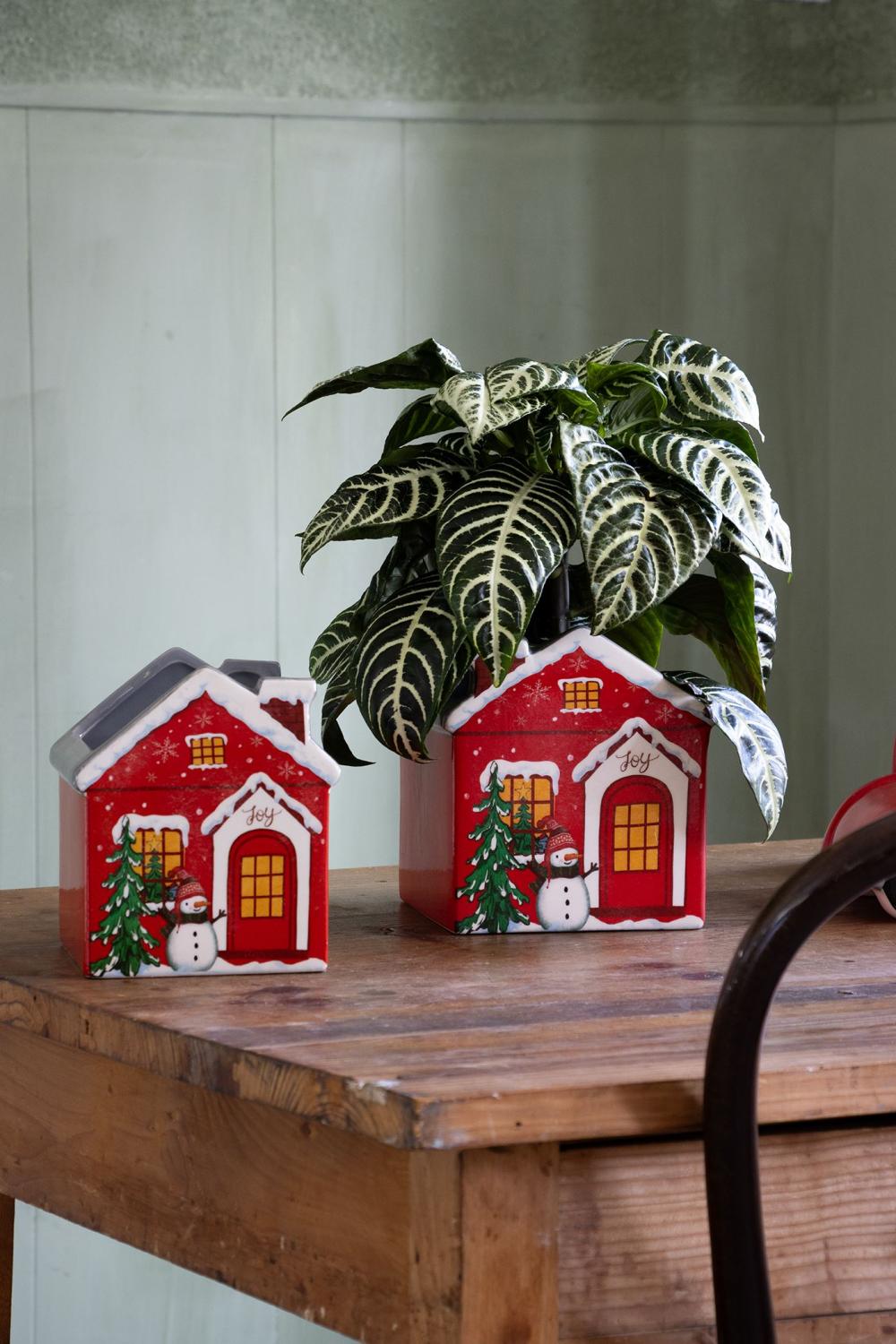 Weihnachtshaus Keramiktopf ARMAS, rot-weiß, 13x13x15cm