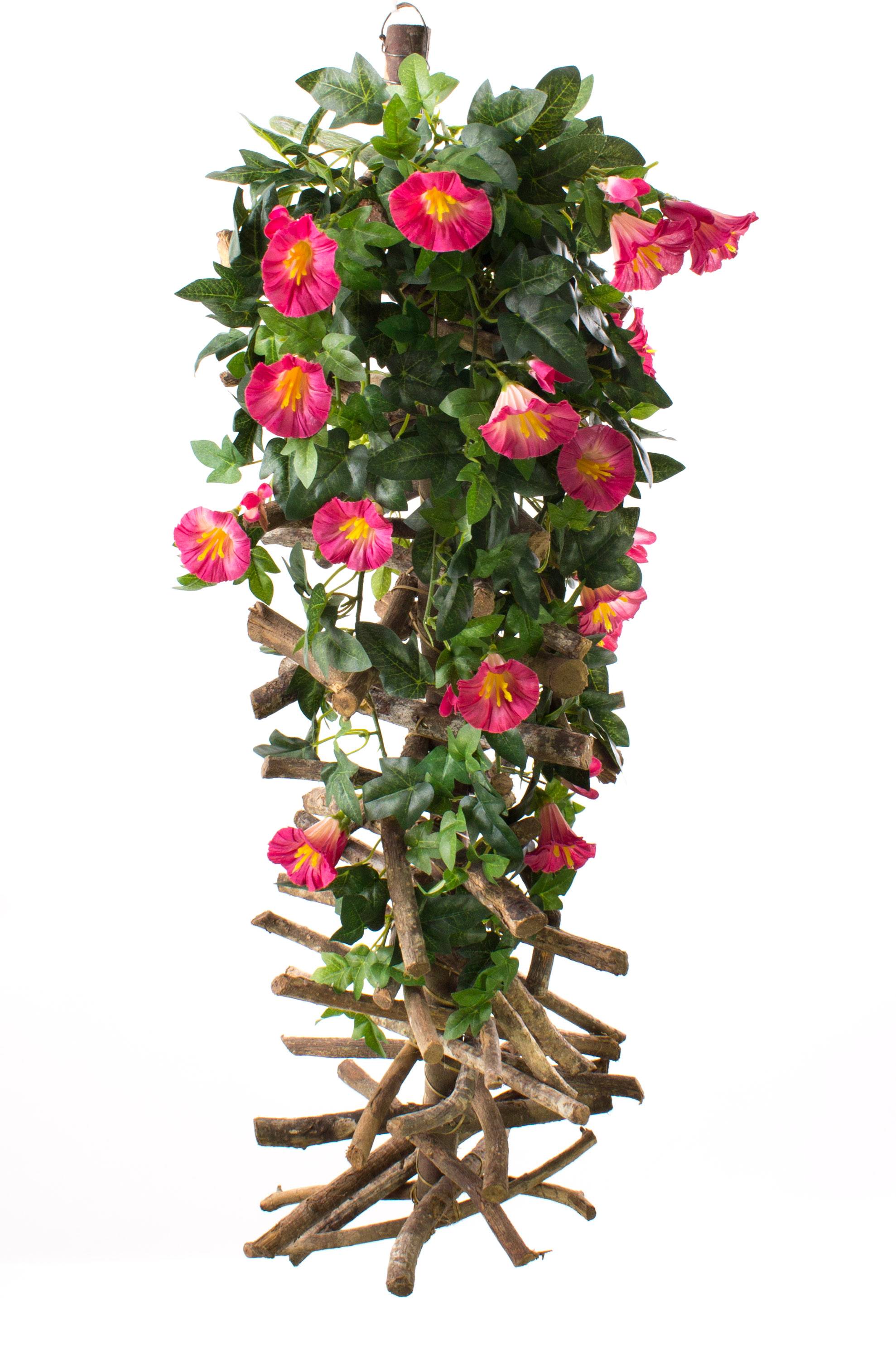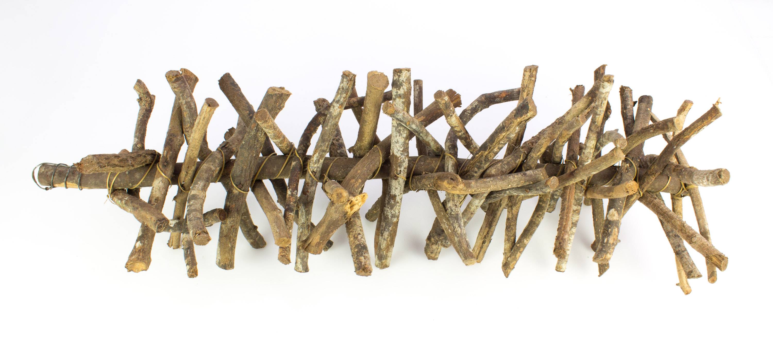 - Lose ca. 45 Stück Holzweige zum Bund mit Schnur starr am Mittelstab gebunden, mit stabilem Draht als Aufhänge Vorrichtung fest montiert.